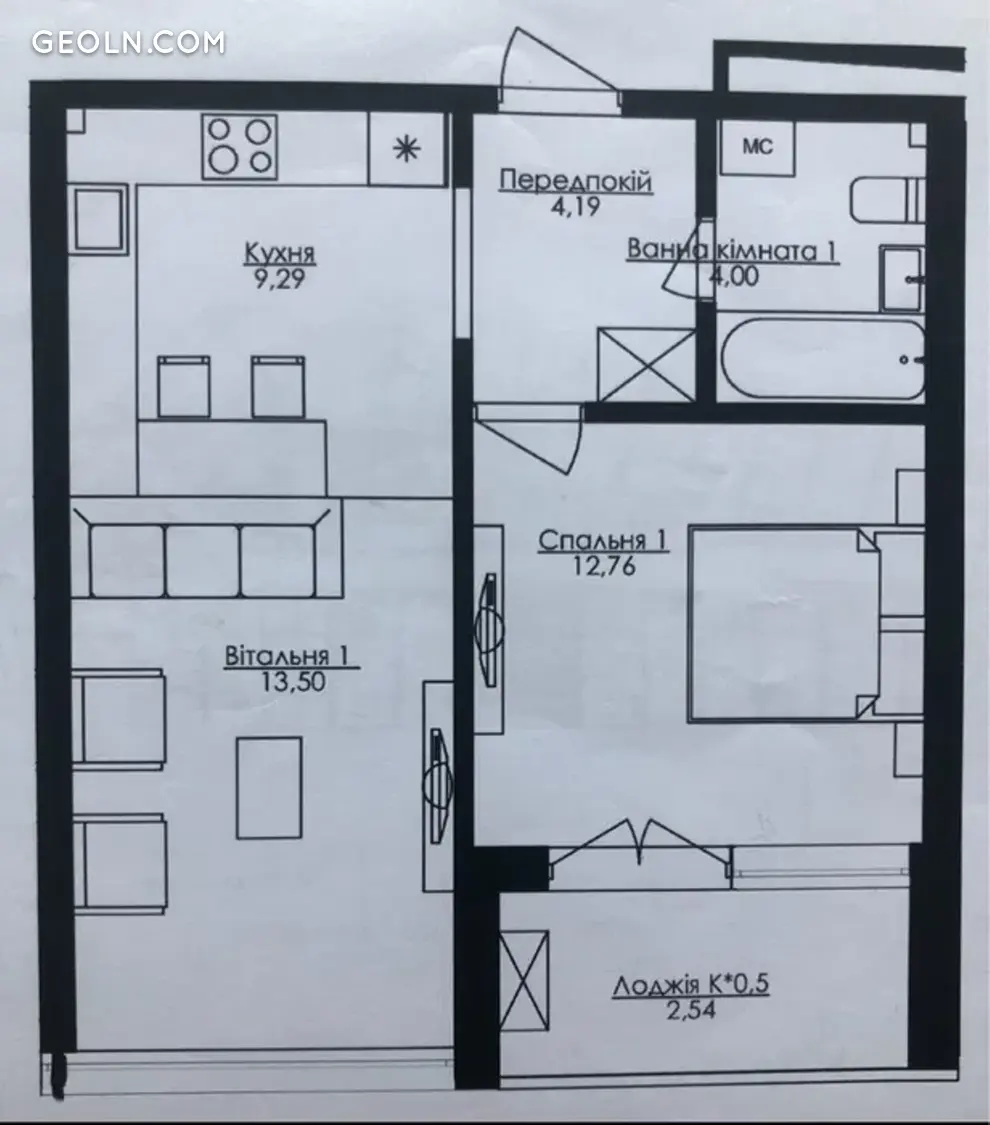 Layout: Separate, includes a kitchen-dining room with access to the loggia and a bright bedroom.