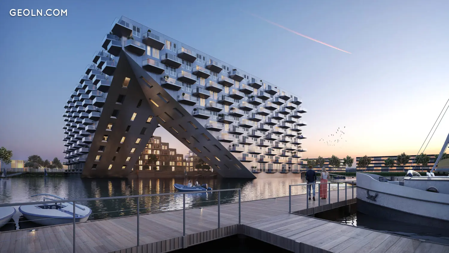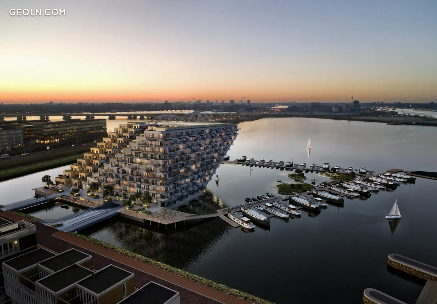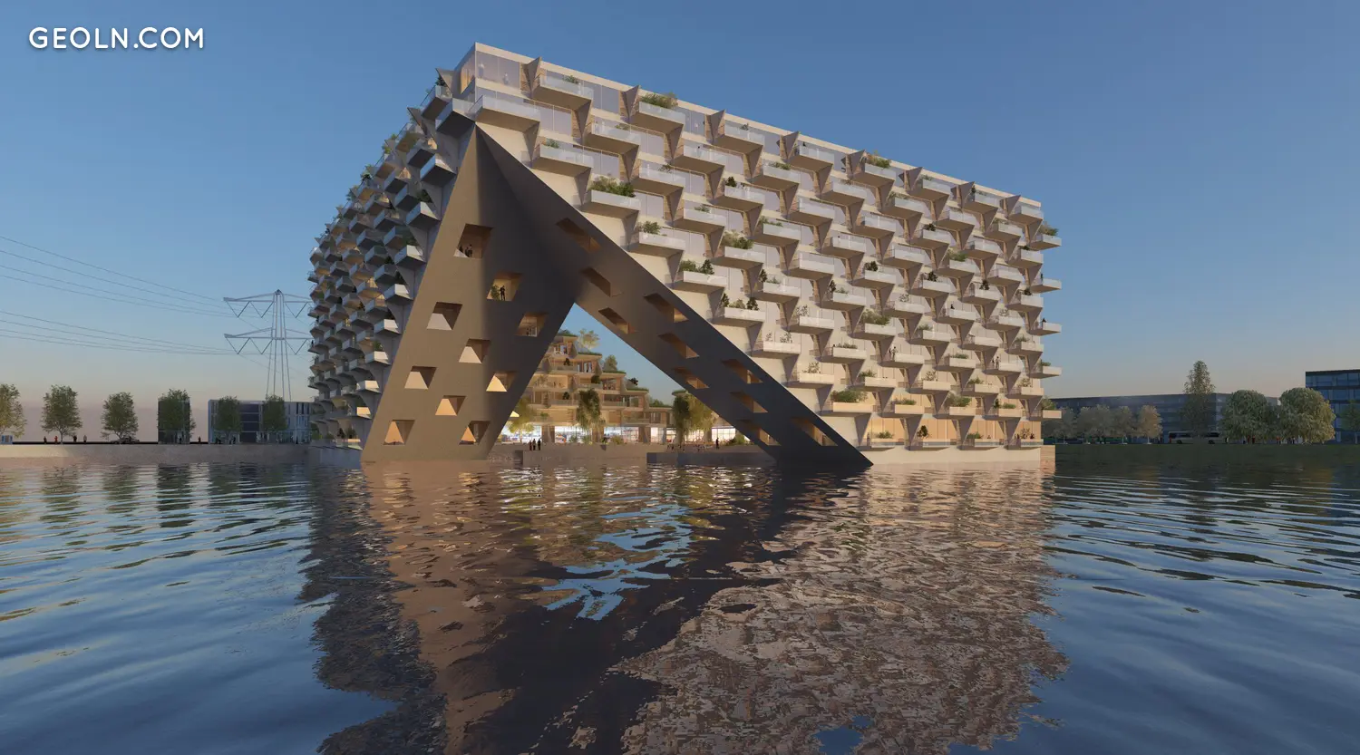 Этот проект, задуманный с использованием полностью интегрированной водной программы, предлагает Амстердаму новый жизненный опыт. Полностью построенная на воде консольная конструкция (2 x 50 метров в длину с каждой стороны) включает 442 энергонезависимых квартиры, двухэтажную подземную парковку ниже уровня воды, участки для плавучих домов, причалы для прогулочных судов, а также объекты общественного питания. как торговые площади. Также предусмотрен широкий спектр услуг, способствующих благополучию пользователей.