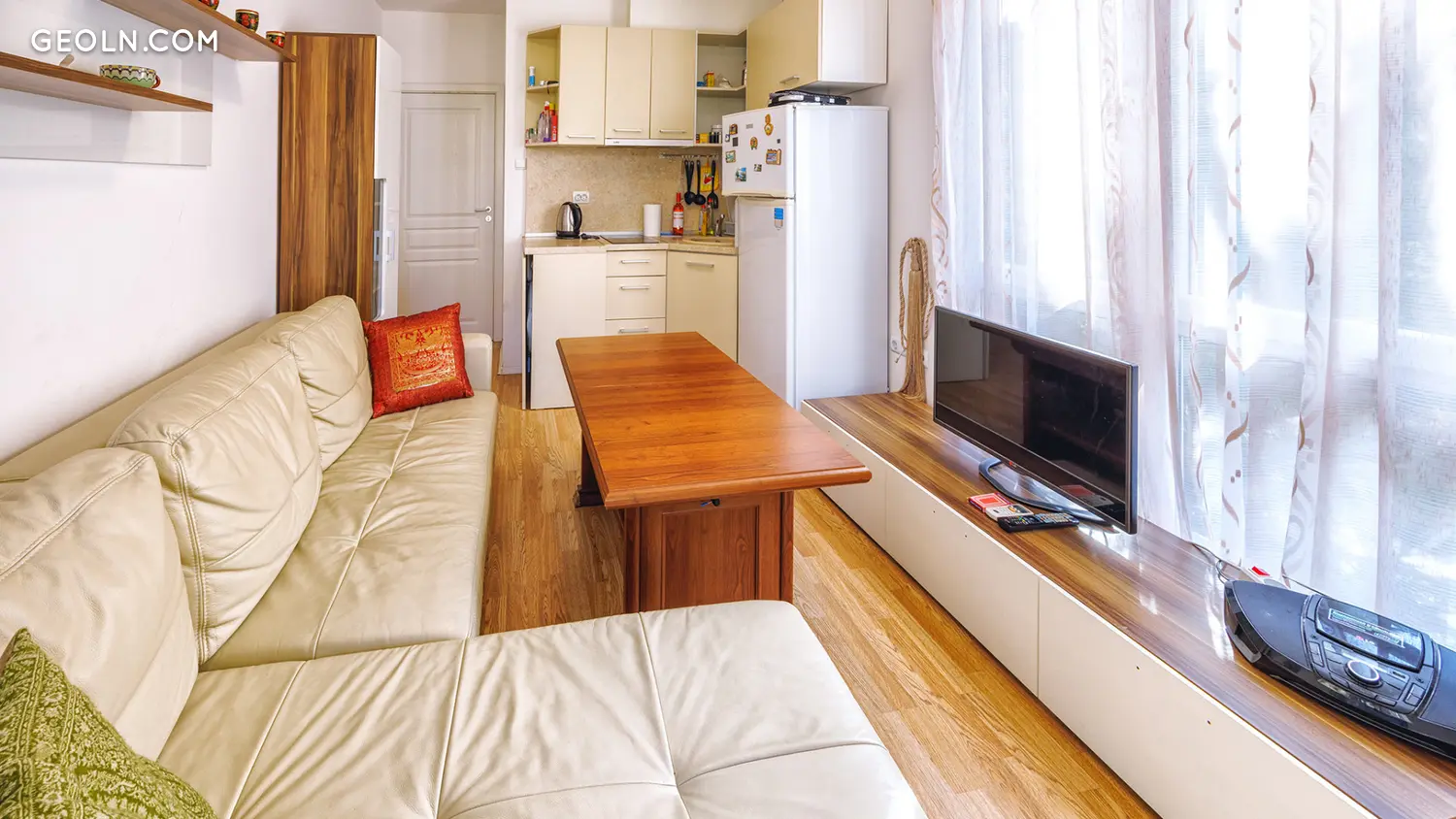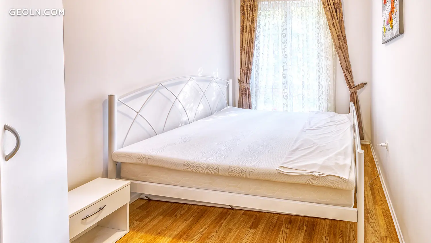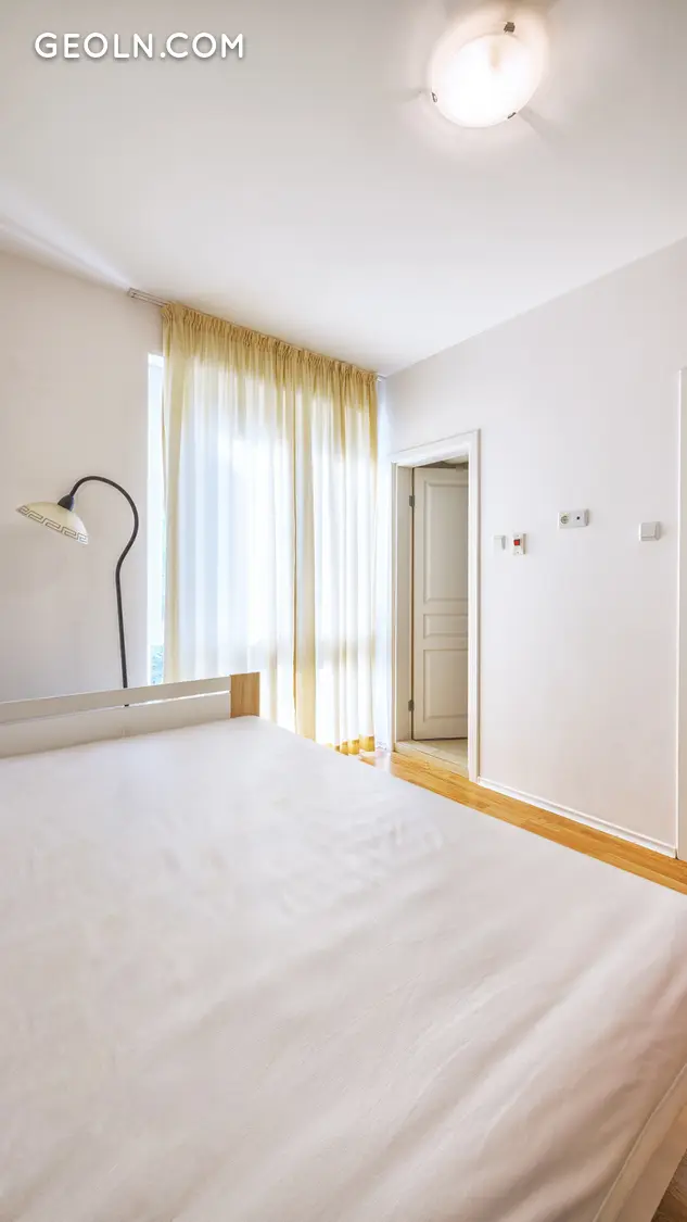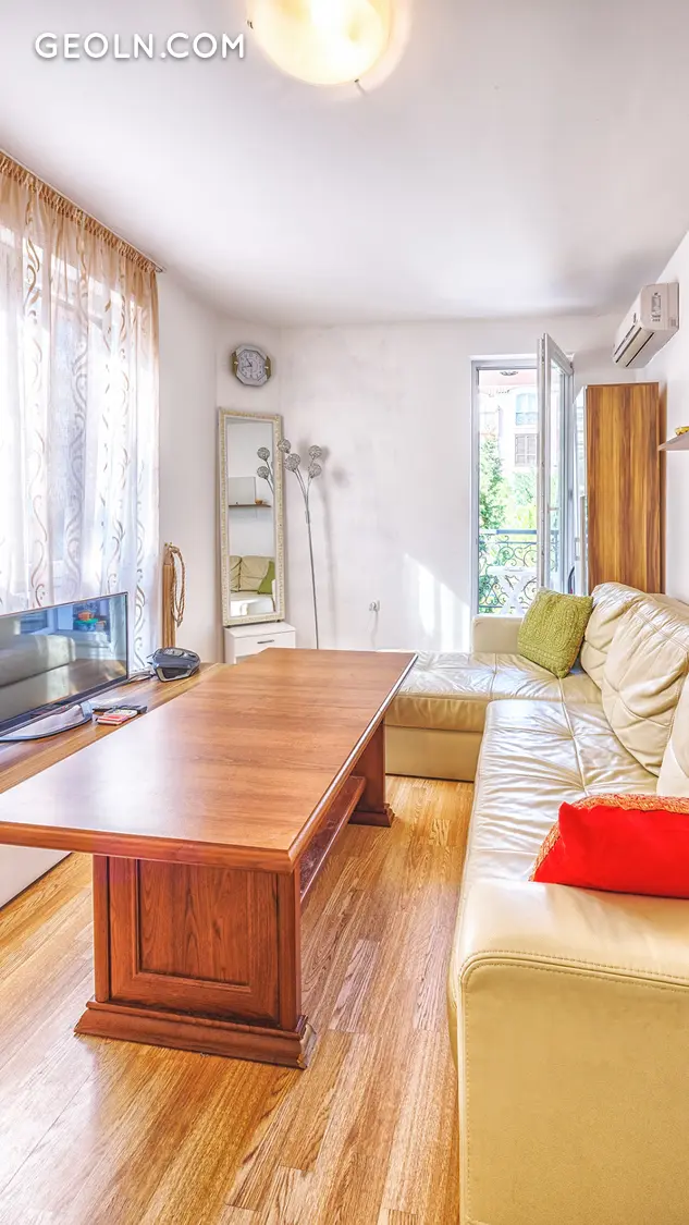 Он расположен на первом жилом этаже и имеет прихожую, гостиную с мини-кухней и обеденную зону, две спальни, две ванные комнаты, два балкона с приятным видом. Продается с качественной мебелью и полностью готов к проживанию.