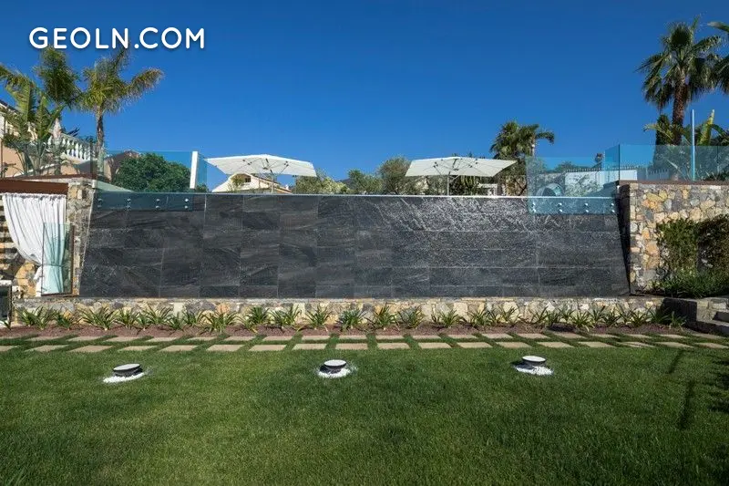 Водный каскад замкнут с бассейном, вода циркулирует постоянно без дополнительных затрат.