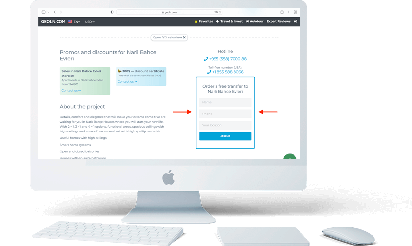 На странице проекта новостройки заполните форму заказа трансфера (форма выделена синим цветом)