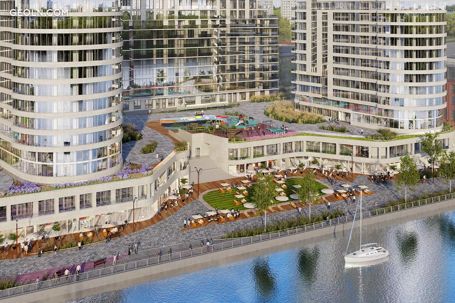 After the Aquatoria complex is fully commissioned, residents will be provided with all the necessary infrastructure facilities that will be located in the stylobate: kindergarten, school, supermarket, shops, cafes, restaurants, a fitness center, and social enterprises.