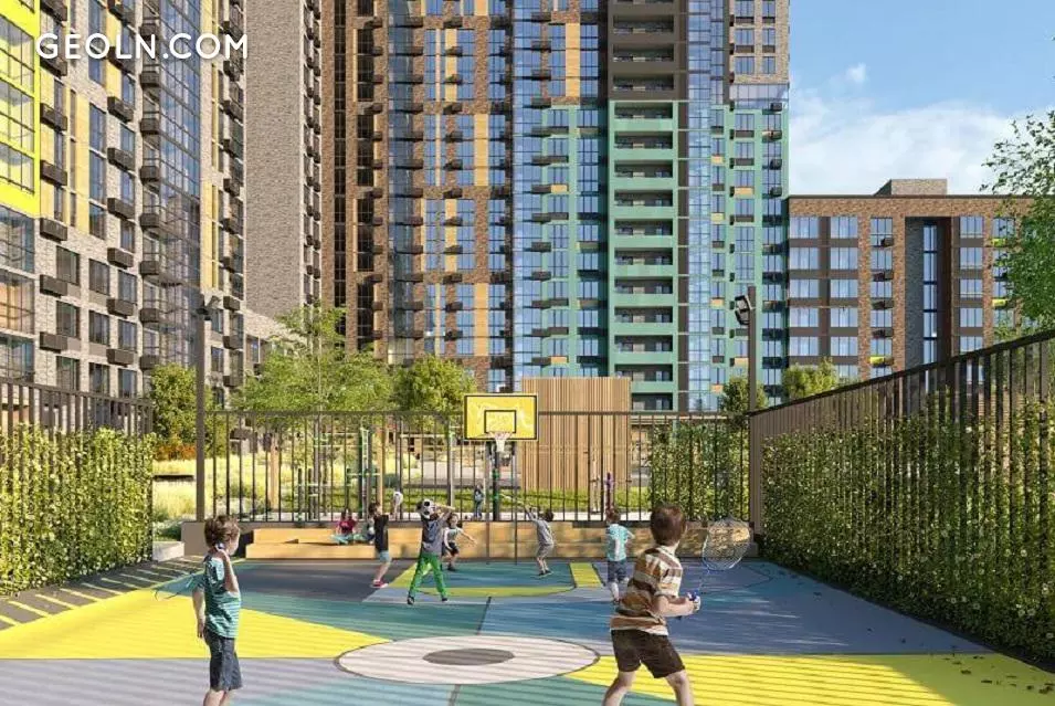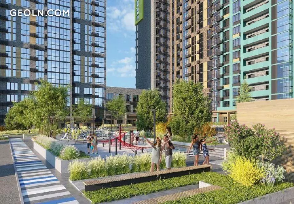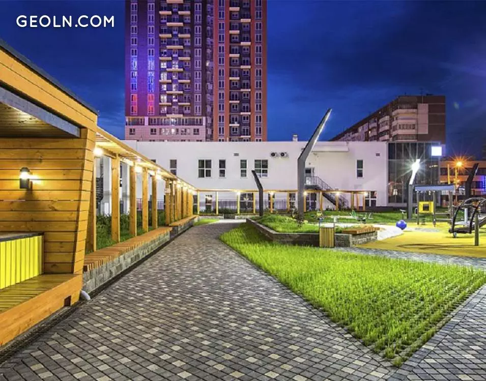 Conceptual landscaping of the courtyard: landscape design, picturesque green alleys, multilevel lighting. Walking areas, sports and playgrounds for different ages.