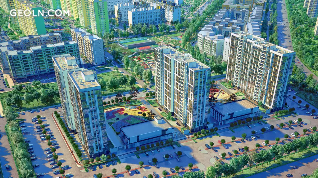The development plan for the territory of the district provides for the creation of a network of driveways and sidewalks, a sufficient number of ground parking spaces, modern sports grounds and, in addition, playgrounds for children to play.