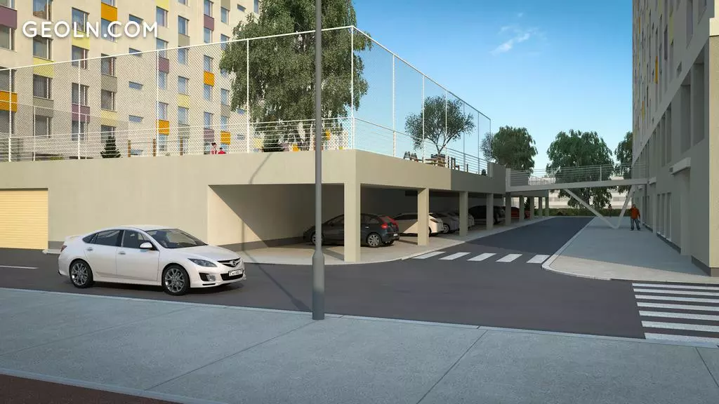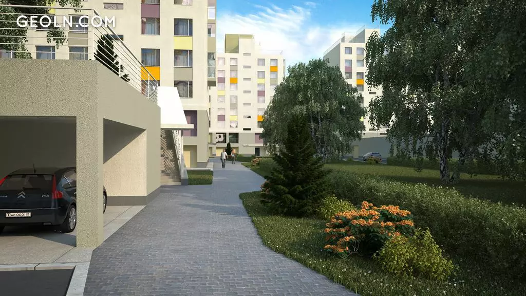 The development plan provides for the equipment of sports and playgrounds with special coating “Regupol”, as well as sites for the installation of garbage containers. Paved driveways and paths for pedestrians are laid. Yard areas, as well as some elements of landscaping, are arranged on the operated roof of the parking garage.