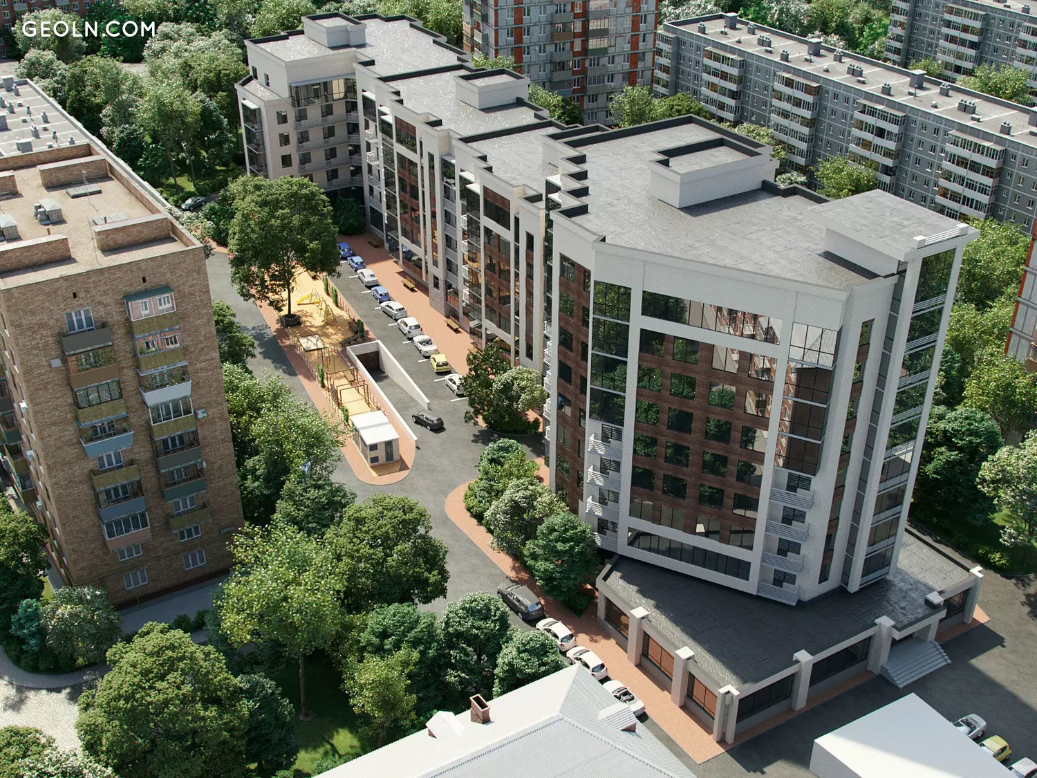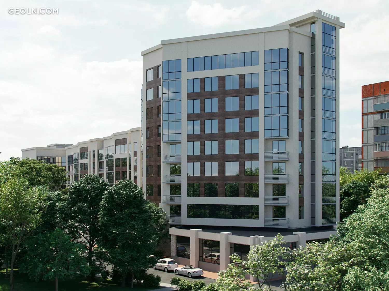 The new residential building is located in the central part of the city, near the street. Voroshilov.