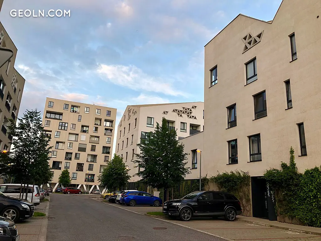 A prominent feature in the architecture of the first and second phases, designed by Vallo Sadovský Architects, is both a modern style and a diverse typology, with a community of residential blocks connected to each other by an atrium filled with plants and trees, intended as a relaxation zone for leisure use by unit residents.