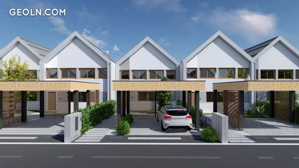 We designed Drenova as a closed and functional settlement of single-family houses with a strong emphasis on the external arrangement of the neighborhood. The neighborhood envisages a total of 78 energy-saving wooden terraced houses in nine sets, with a uniform appearance and external arrangement. All houses will be completed on a turnkey basis and with fully landscaped attached land. The external arrangement of each plot is planned as a combination of paved and green areas. A carport for two vehicles, an outdoor terrace and a garden shed will be erected and arranged on each plot.