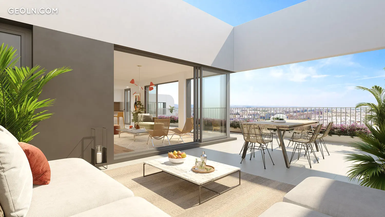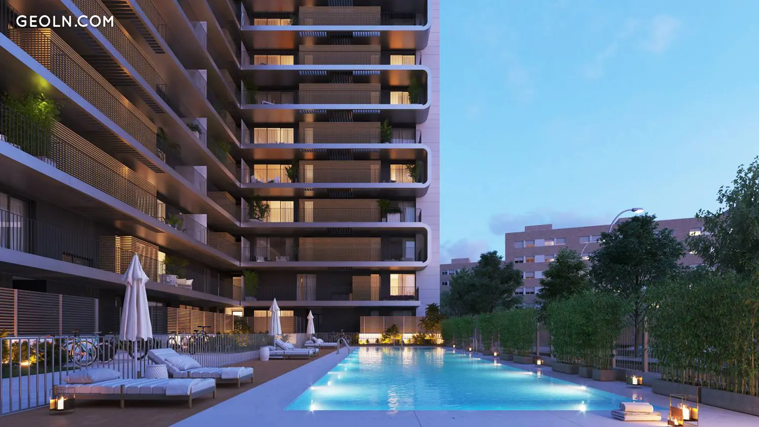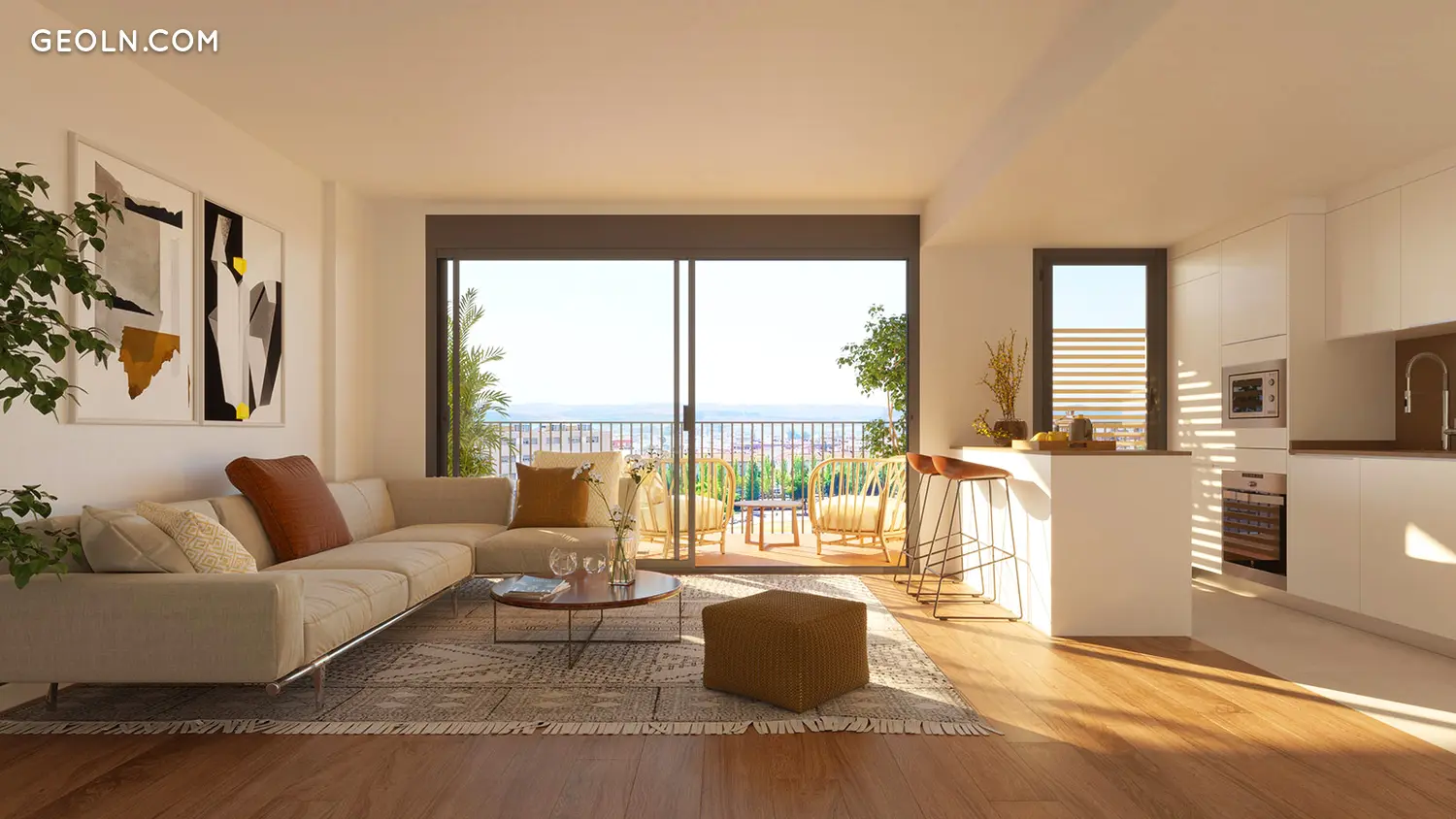 On the outside, the large glazed surface is dynamic and acquires movement thanks to the curved lines that run along the façade. A distinctive element that draws the profile of the terraces and the upper ends of each building. The result is a project with its own personality that offers spacious and bright homes under the seal of an unmistakable design.