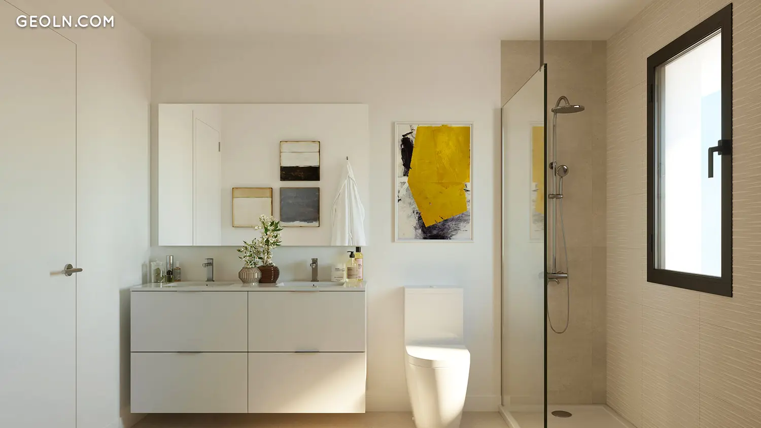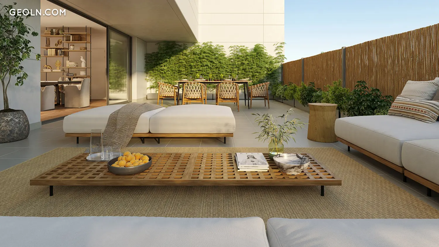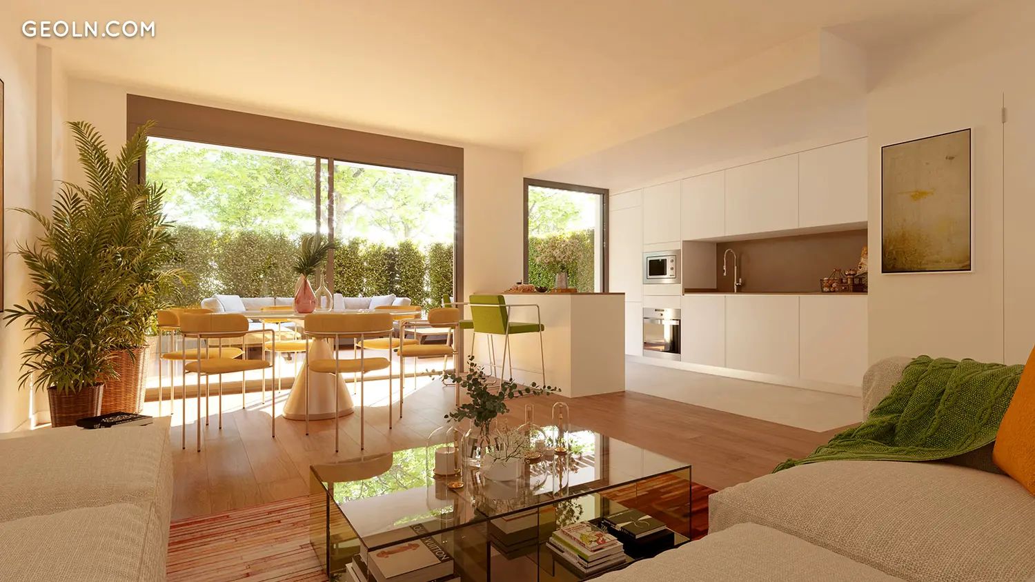 On the outside, the large glazed surface is dynamic and acquires movement thanks to the curved lines that run along the façade. A distinctive element that draws the profile of the terraces and the upper ends of each building. The result is a project with its own personality that offers spacious and bright homes under the seal of an unmistakable design.