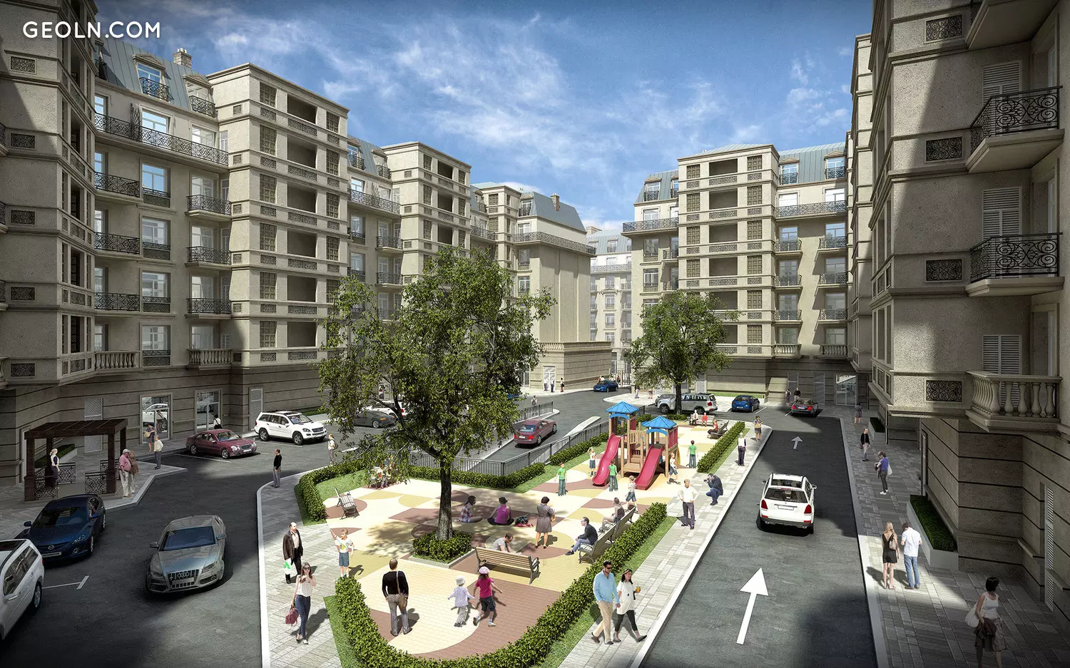 Konut kompleksi "Monparnas Residence", yerel iklim koşulları ve binanın gerekli gücü seviyesi dikkate alınarak, Fransa'nın başkentinin semtlerinden biri tarzında tasarlanmıştır.