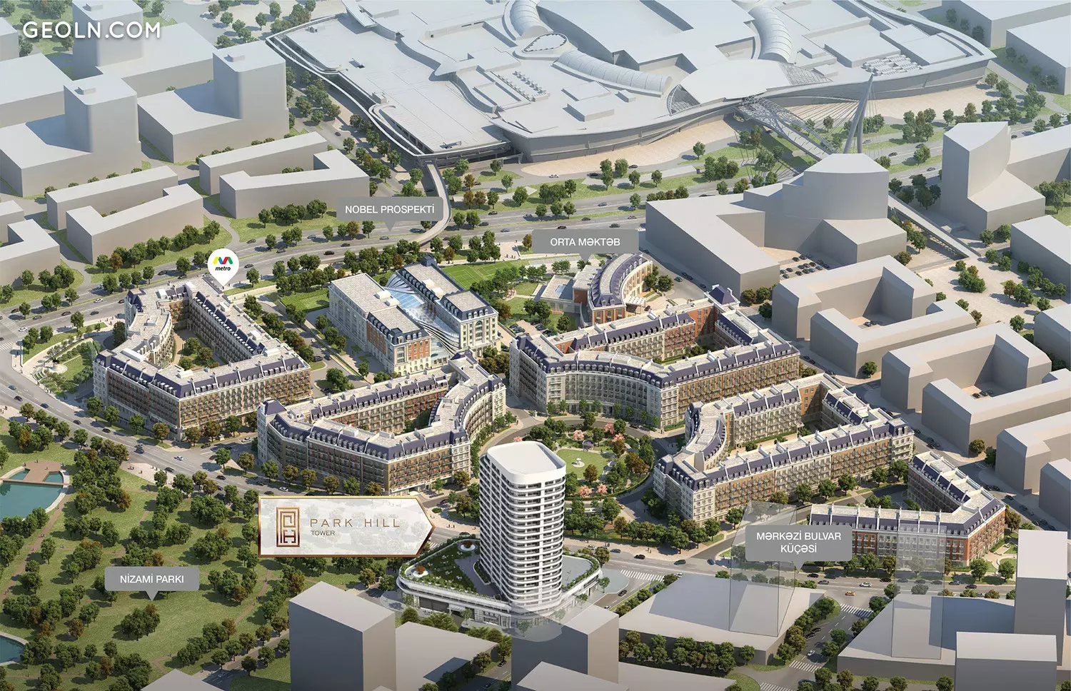 Bakü'deki Park Hill Tower konut kompleksi, yeni Beyaz Şehir mikro bölgesinde, Nobel Bulvarı'na 400 metre uzaklıkta yer almaktadır. Yol ağı ve sosyal açıdan önemli tesisler de dahil olmak üzere yerel altyapı sıfırdan inşa ediliyor. Burada sanayi kuruluşu yok - en yakını yedi yüz metre uzakta. Deniz kıyısına on dakikada ulaşılabilir.