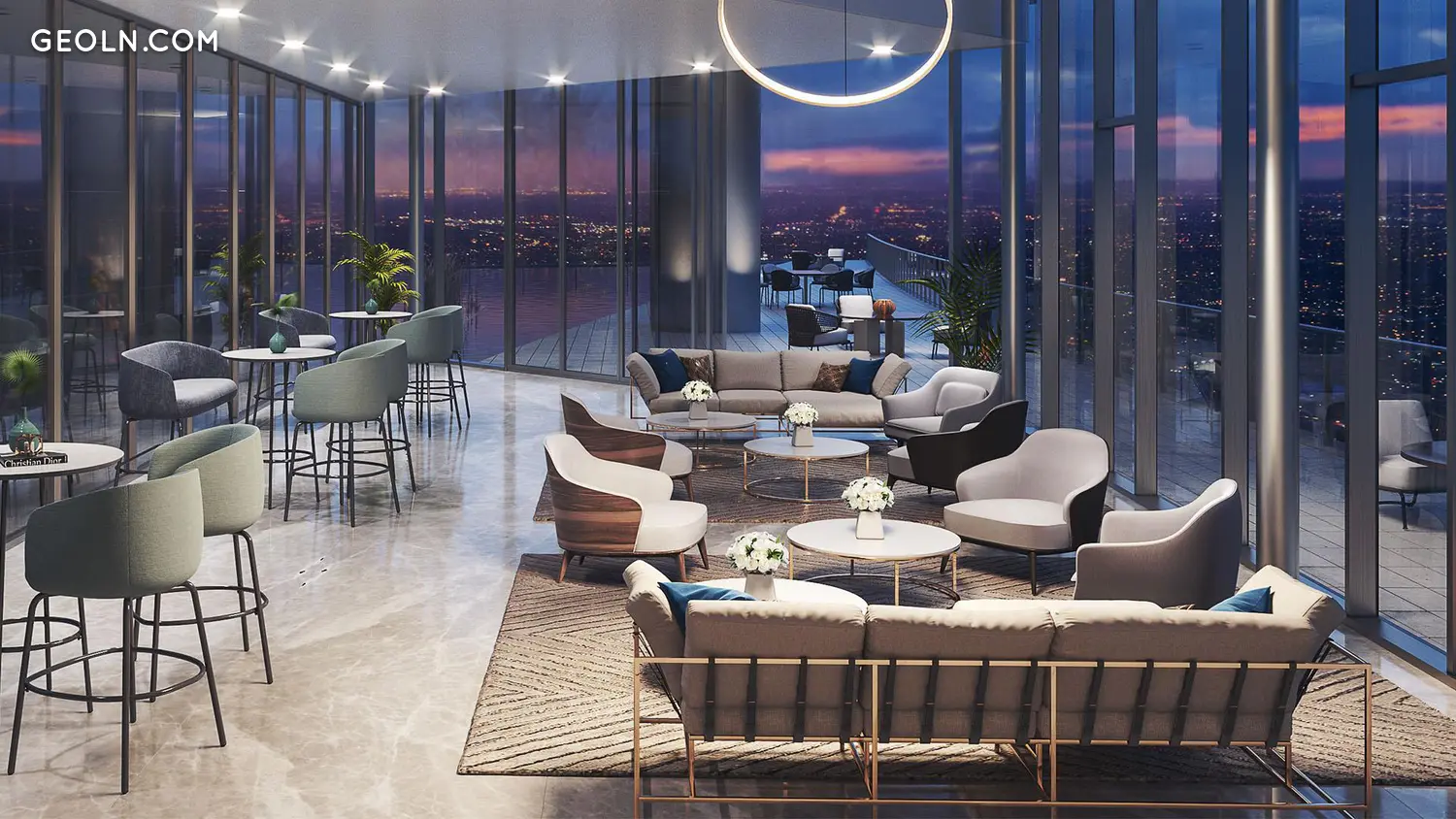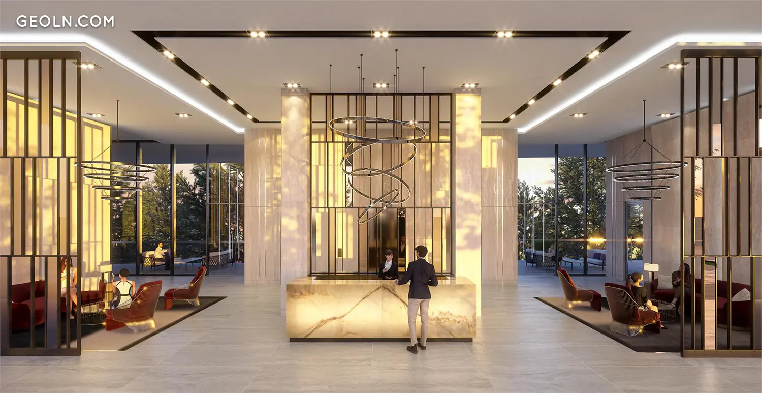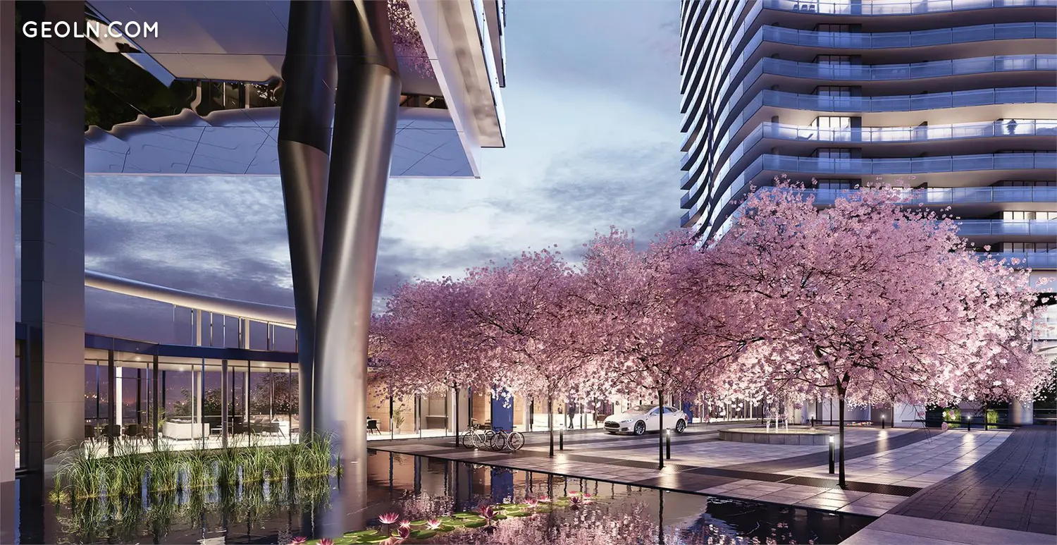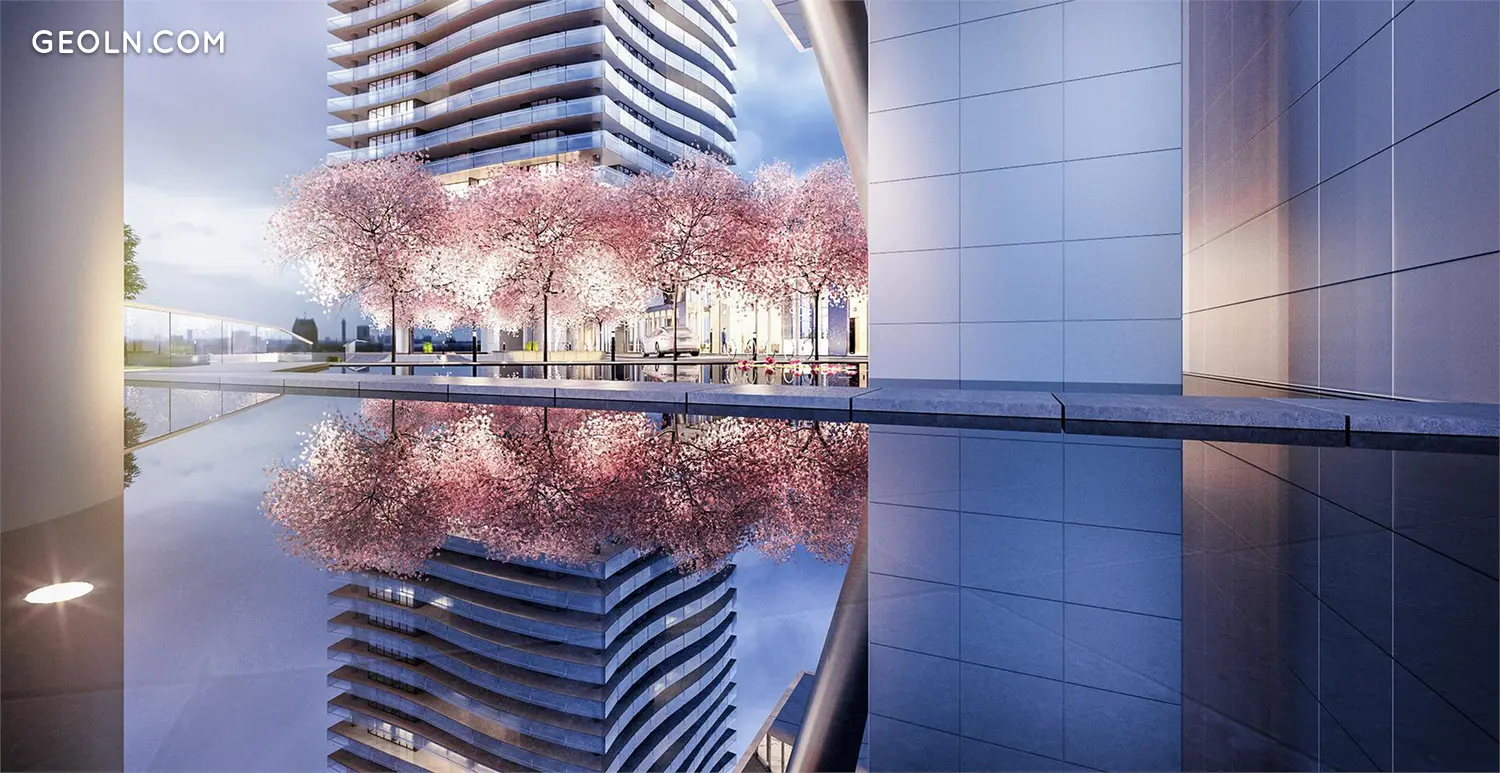 Cadde seviyesinden itibaren her mimari detay güçlü bir varlığı çağrıştırıyor. Güzel bir şekilde düzenlenmiş avluya ve sakin aydınlatma ve zarif su özelliklerine sahip motor kortuna varın. Yansıtıcı ayna alt yüzey detayları, güçlü bir mimari ifade oluşturur. Yükselen 38 fitlik sütunlar, konut binalarını ağacın tepesine yükseltir.