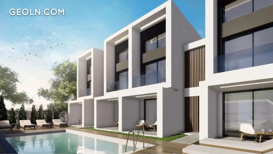 Zemin kattaki dairenin hem önünde hem de arkasında pergolalar bulunurken, zemin katın arkasında şezlonglar için bir alana sahip ortak bir yüzme havuzu vardır.