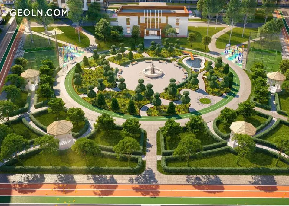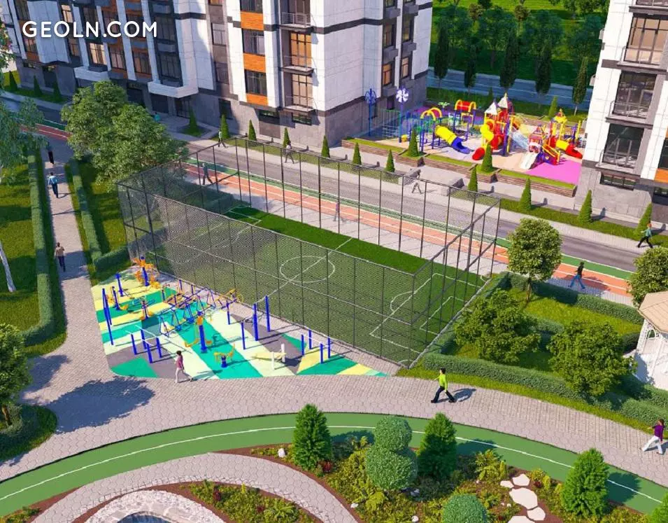 Geniş bitişik bölge tamamen arabasızdır ve park bölgesi prensibine göre planlanmıştır. Çocuklar için çeşitli oyun alanları, oyun ve spor yerleri, yürüyüş kaldırımları olacak. Bölgenin peyzaj tasarımı, yılın herhangi bir zamanında sakinleri memnun edecek şekilde düşünülmüştür.