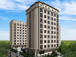 El complejo consta de tres edificios entrelazados de doce pisos, diseñados con el mismo estilo teniendo en cuenta el clima local y las características de la actividad sísmica en esta parte de la región.