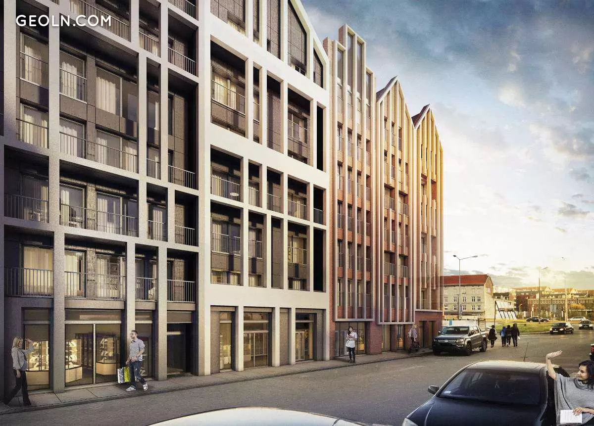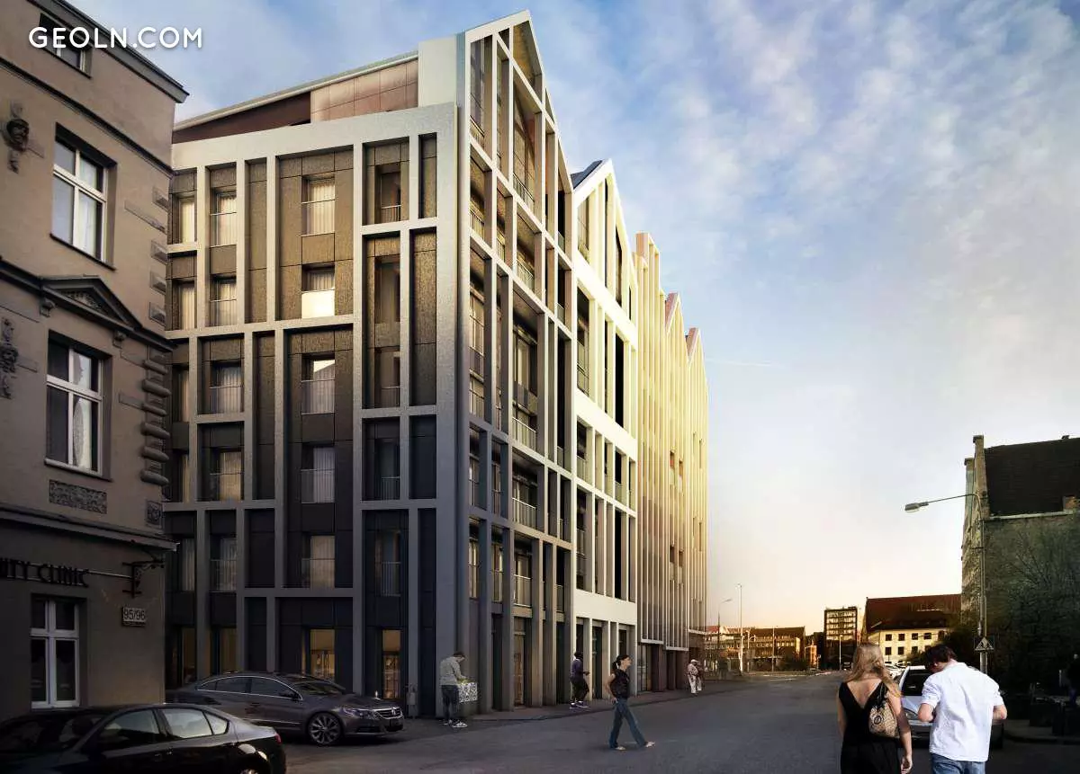 Yatırımın projesi mimari stüdyo KD Kozikowski Design tarafından hazırlandı. Yatay olarak yönlendirilmiş altı katlı apartmanın tarzı, arsa bölümleri ve eğimli çatıları ile şehrin tarihi binalarına atıfta bulunuyor. Cephe, klinker astar, çok sayıda cam ve ahşap pencere çerçeveleri ile kırmızı tuğla ve beyaz tonlarındaydı. Ortak alanların iç mekanları Art Deco tarzında yapılmıştır.