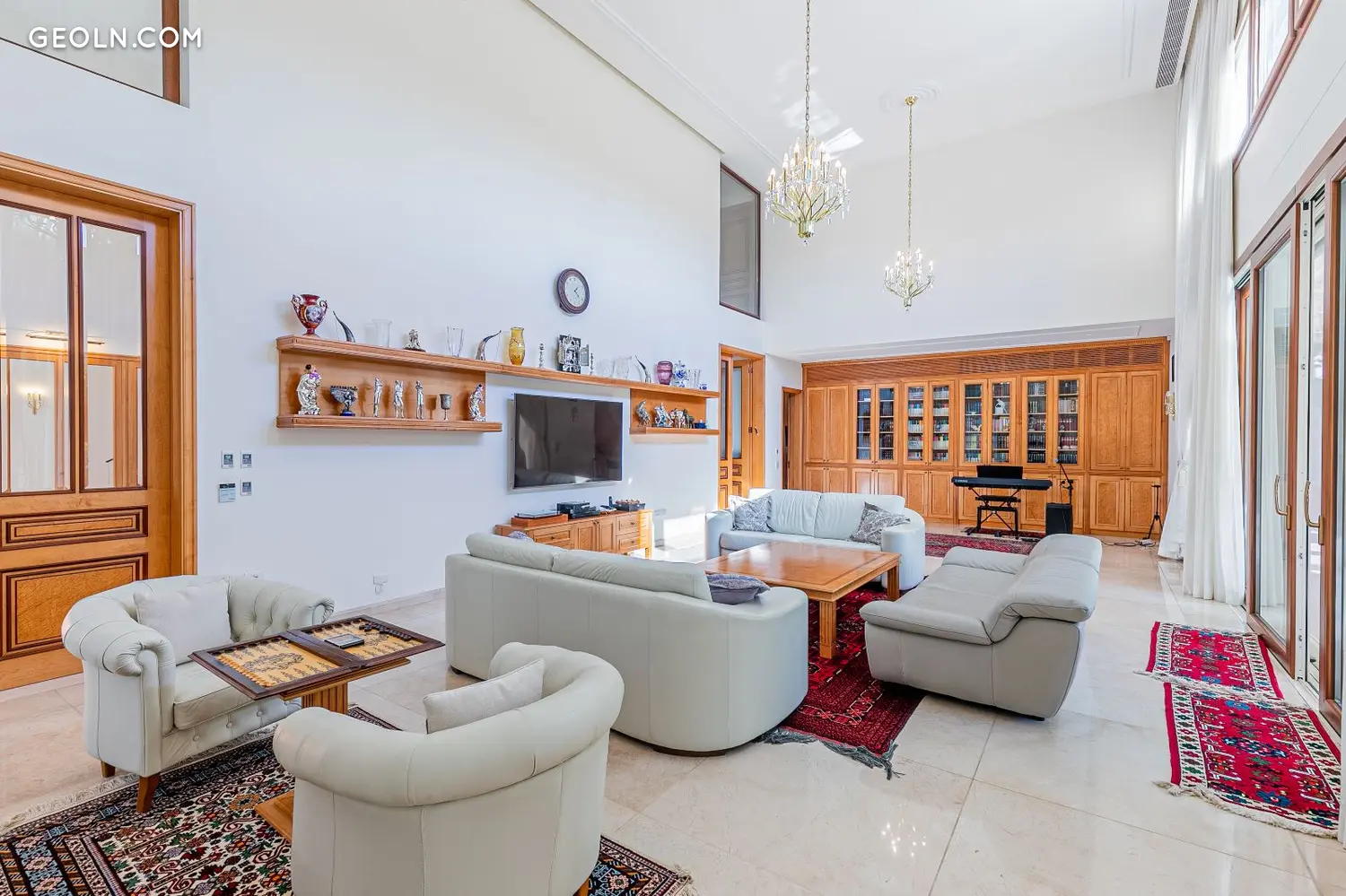 Pencere çerçeveleri, kapılar ve tüm gömme mobilyalar, özel işleme tabi tutulmuş değerli ağaçlardan yapılmış, el yapımı özel çizimlere göre üretilmiştir.