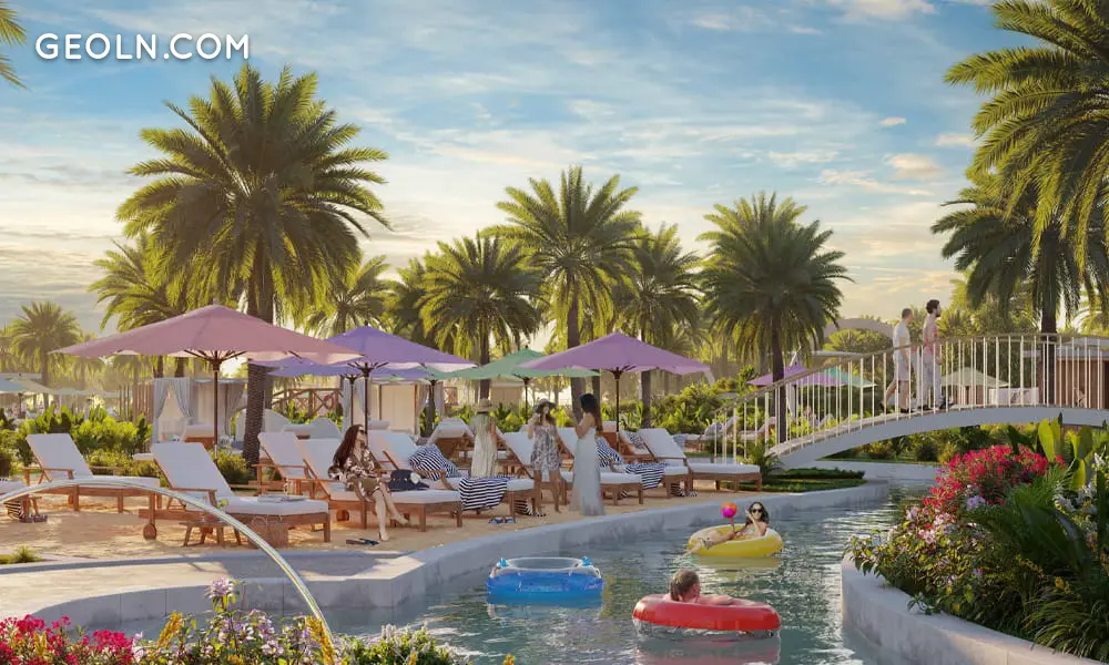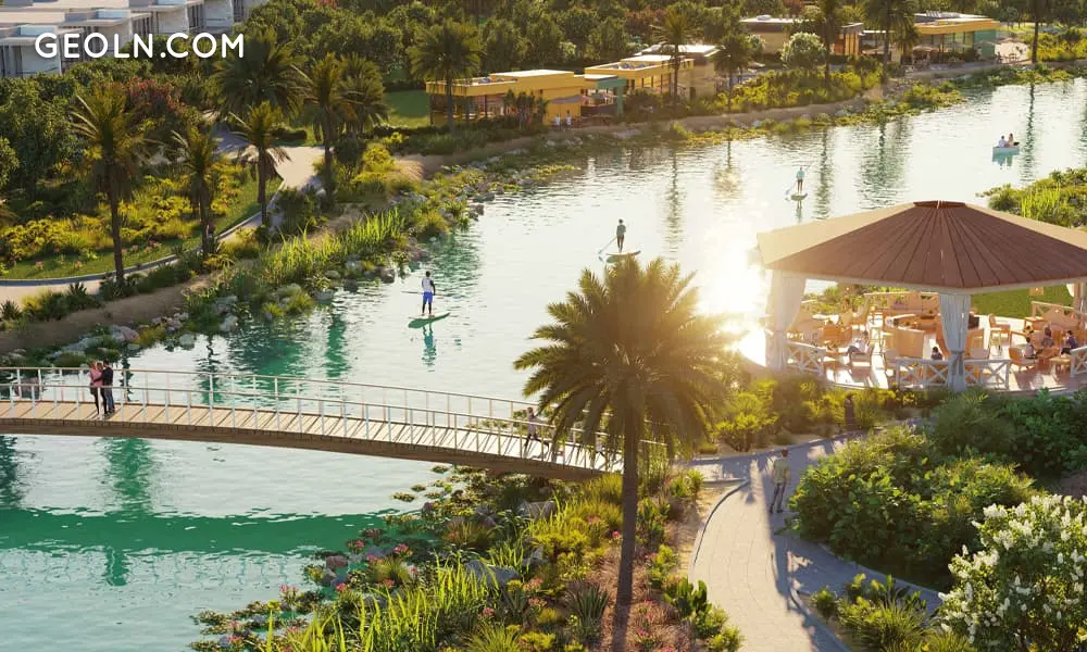 Удобства: волновой бассейн, плавучий кинотеатр, кафе, зона для барбекю, детская игровая зона, гигантская шахматная доска, амфитеатр, ферма, беговые дорожки, велодорожка, волейбольная и баскетбольная площадки, футбольное поле, поле для крикета, фитнес-зона, открытый спортзал, корты для игры в теннис и падел-теннис, парк для пейнтбола.