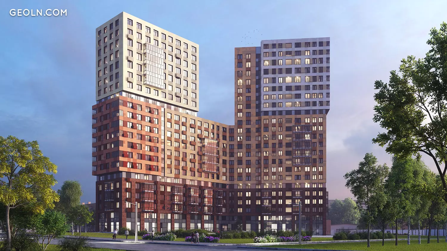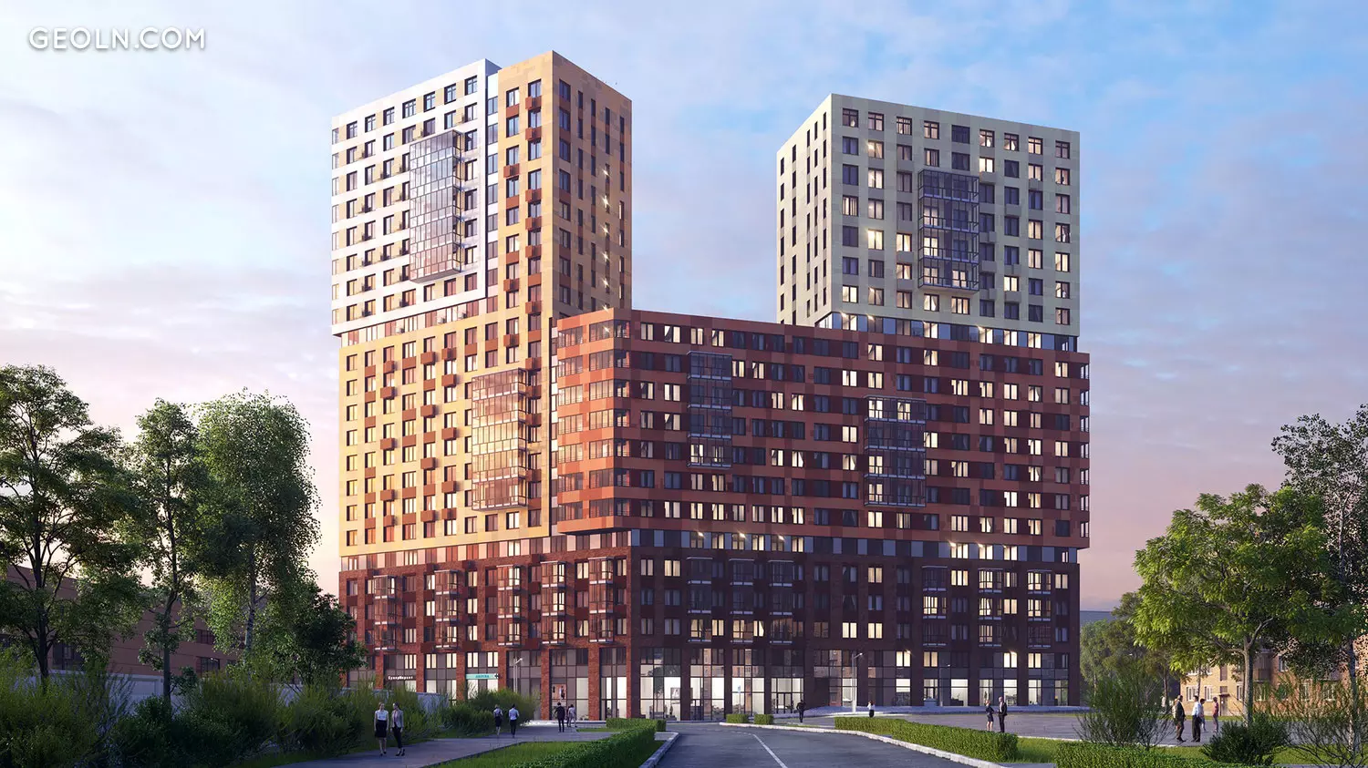 El complejo residencial "Grani" es una casa de clase ejecutiva de estilo industrial con fachadas modernas pintadas en colores brillantes y soleados, con apartamentos de diferentes tamaños y distribuciones.