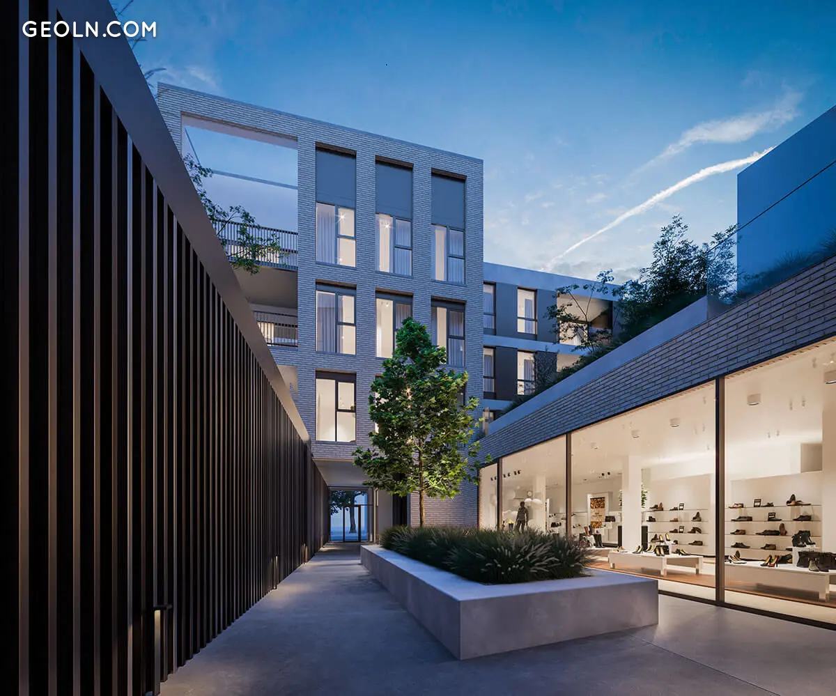 Чотири невеликих обсяги, по два на кожній вулиці, складаються з 18 квартир і комерційного цокольного поверху. Кожен том відрізняється висотою, глибиною та ідентичністю. Існує два типи фасадів. Перший заснований на типових вертикальних міських фасадах мікрорайону. Другий побудований більш горизонтально. Білий бетон і світло-сіра кладка завжди чудово контрастують з обробкою бронзового кольору та столярними роботами в тому ж відтінку. Таким чином, архітектурне розмаїття вноситься в загальну концепцію, яка органічно вписується в вуличний пейзаж.