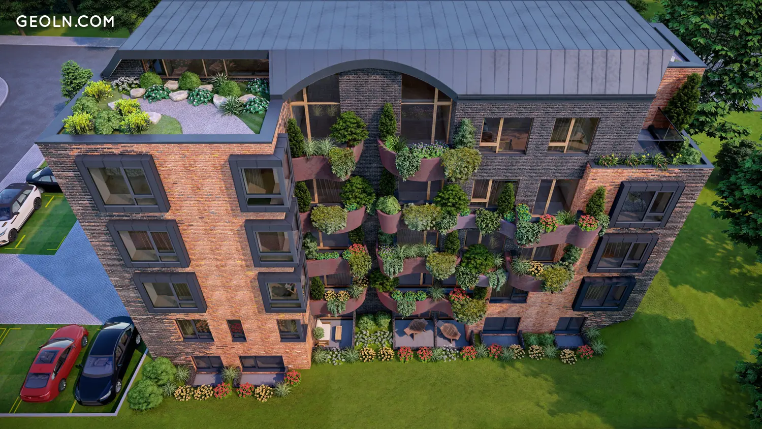 Вертикальні підвісні сади на кожній терасі - з крапельним зрошенням та розумним управлінням. Тут ми прагнемо не тільки використовувати природні матеріали, але і буквально озеленити фасади, які ми перетворимо у вертикальний вічнозелений ліс з контрольованим зростанням, без необхідності спеціального догляду за садом - підтримується автоматичними, водозберігаючими зрошувальними системами .