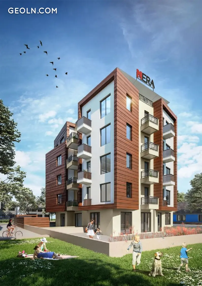 Будівля розташована в центральній частині ділянки, яка має площу 1,4 декара з майже правильною прямокутною формою, що виходить на вулицю Асена Разцвітнікова. Для зовнішньої обробки використовуються три типи матеріалів: біла штукатурка, дерев'яна вагонка HPL та керамічна плитка, таким чином майже ½ фасаду провітрюється. Будівля розроблена 46 шт. квартири з однією, двома або трьома спальнями, 1 магазином, кафе та дитячим майданчиком. Для кожної ділянки є місце для паркування або гараж. Один під’їзд із кімнатою для домовика, 7-8 житлових одиниць на поверх, а також ліфтом на 6 осіб.