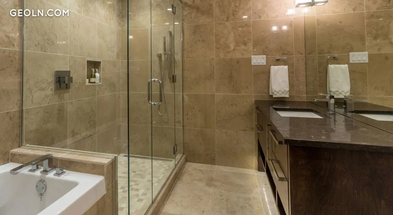 - мармурова підлога у ванній кімнаті зі змішувачами Grohe