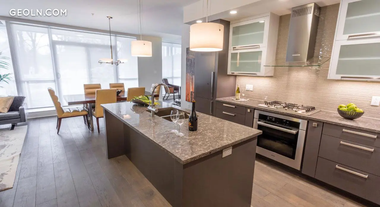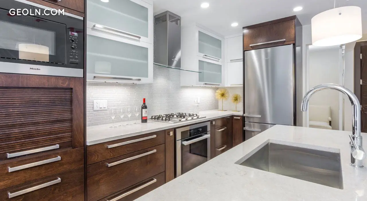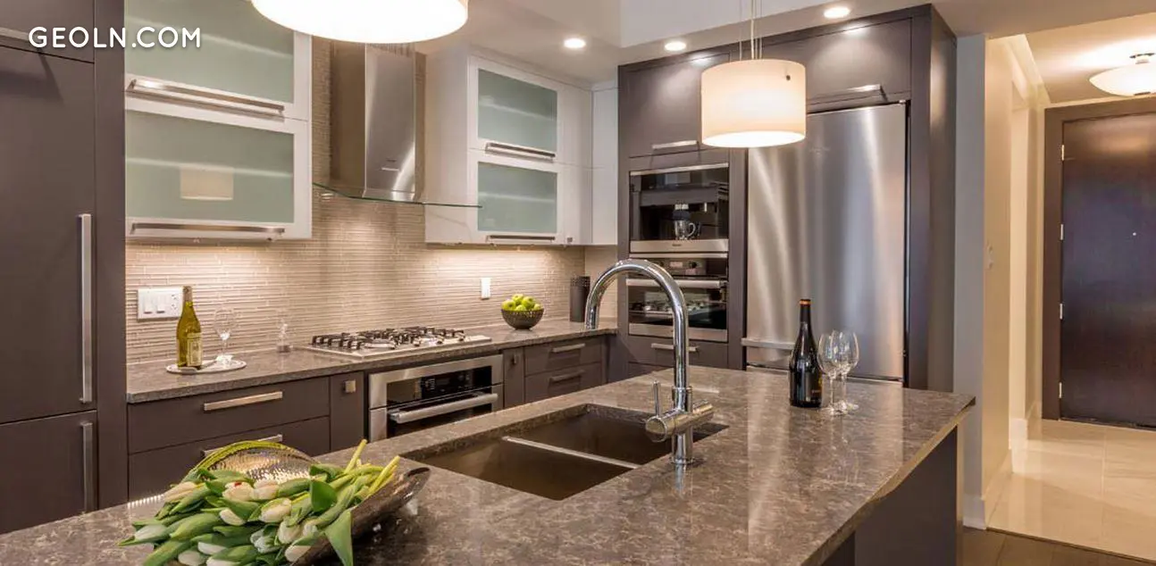 - Кам’яні кухонні стільниці зі зворотною заставкою із скляної плитки