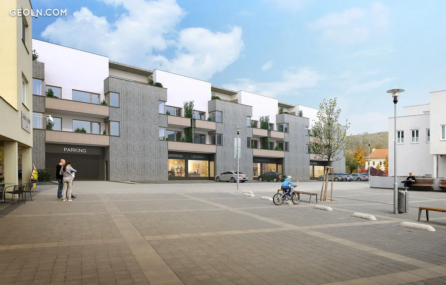 Усі громадянські зручності близькі до проекту. До всього, що вам потрібно, легко дійти пішки. У будівлі Rezidence u zámku входи в комерційні приміщення та вхід у гараж розташовані у напрямку до центру площі, де є місце для 27 паркувальних місць, технічних приміщень та льохів. Перед будинком буде 40 паркомісць для мешканців.