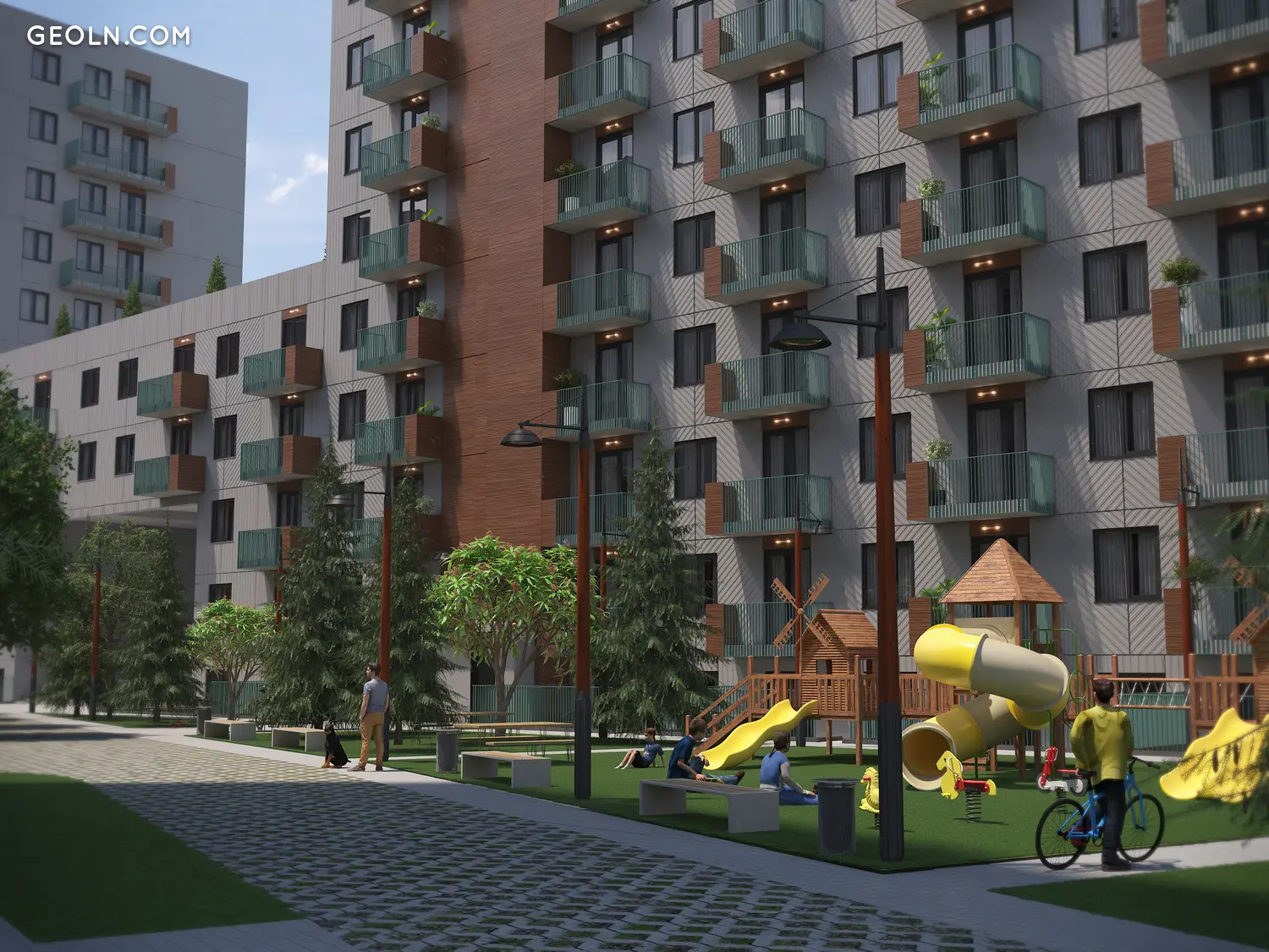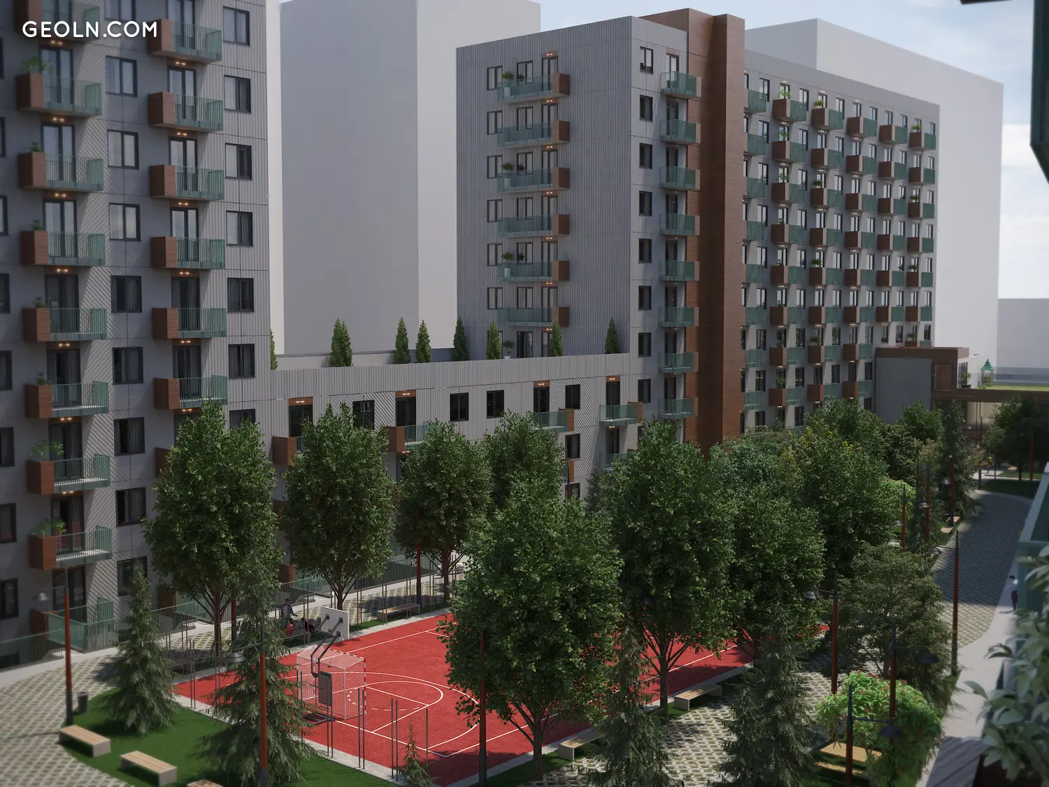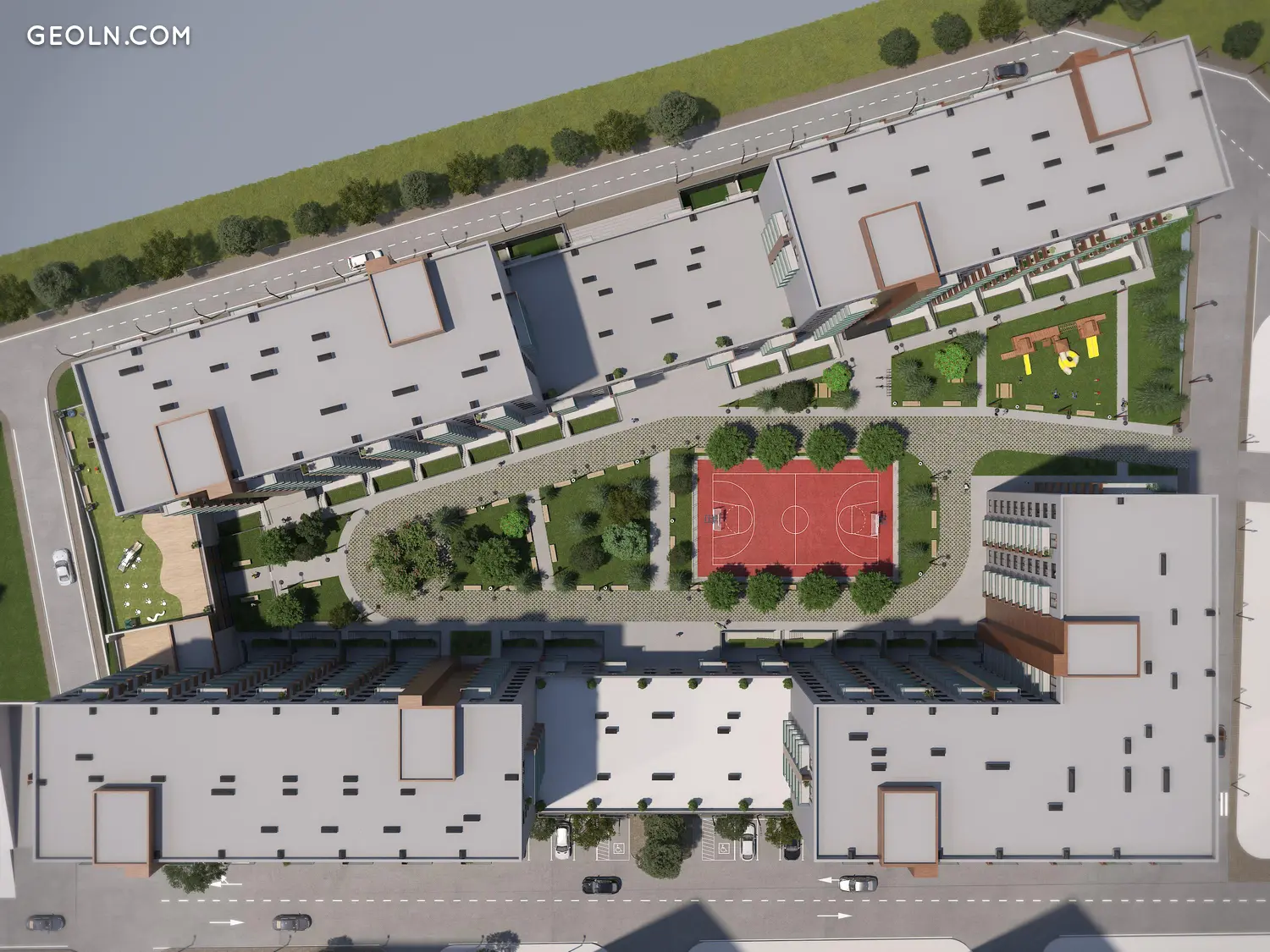Нова будівля матиме просторий підземний паркінг, а також облаштований внутрішній дворик з дитячими майданчиками, зонами відпочинку та велосипедними доріжками. Для людей різного віку доступний добре обладнаний спортивний майданчик.