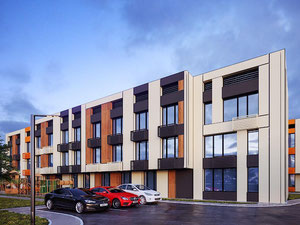 Фасад утеплюється плитами мінеральної вати. Зовні будинку облицьовуються навісними вентильованими панелями. На фасаді передбачені спеціальні кошики для установки кондиціонерів.