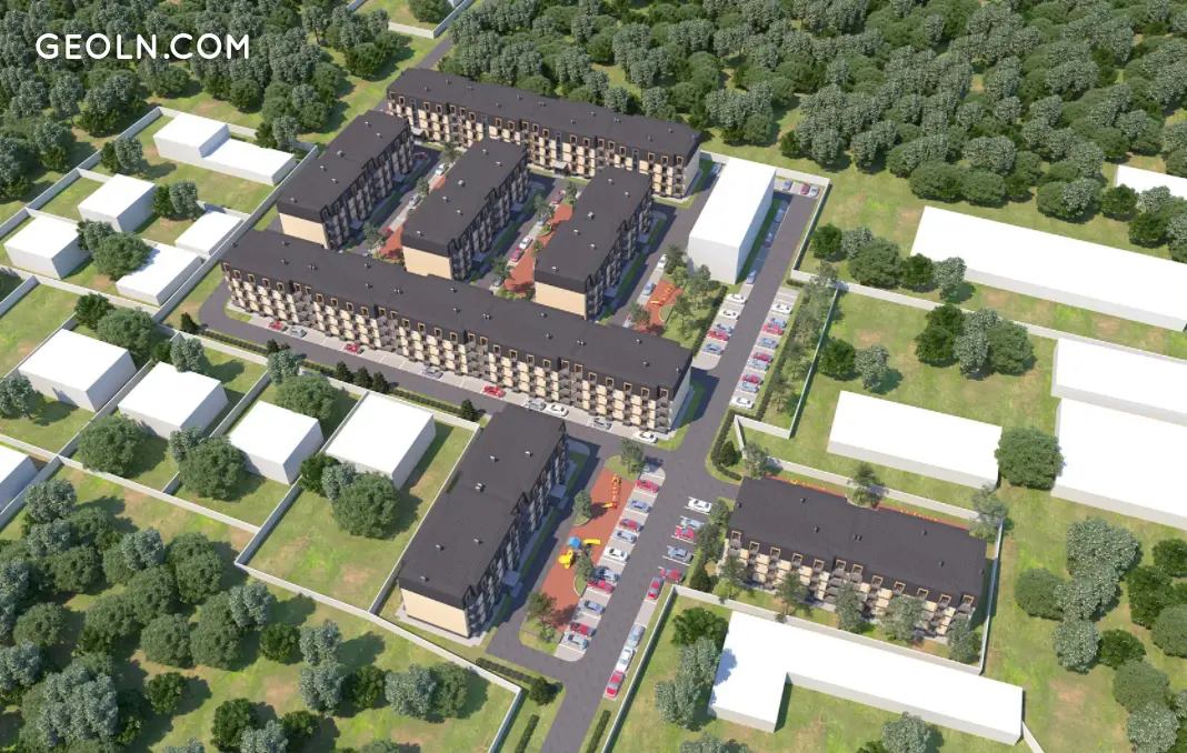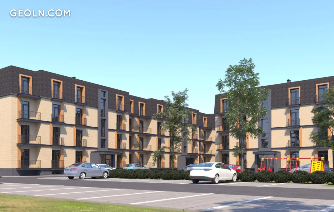 Між будинками прокладаються викладені тротуарною плиткою пішохідні доріжки і асфальтовані проїзди, на території висаджуються декоративні дерева з чагарниками, розбиваються клумби, встановлюються ліхтарі.