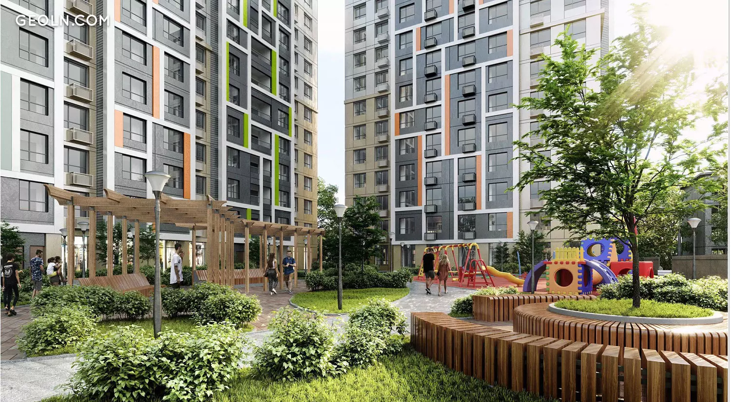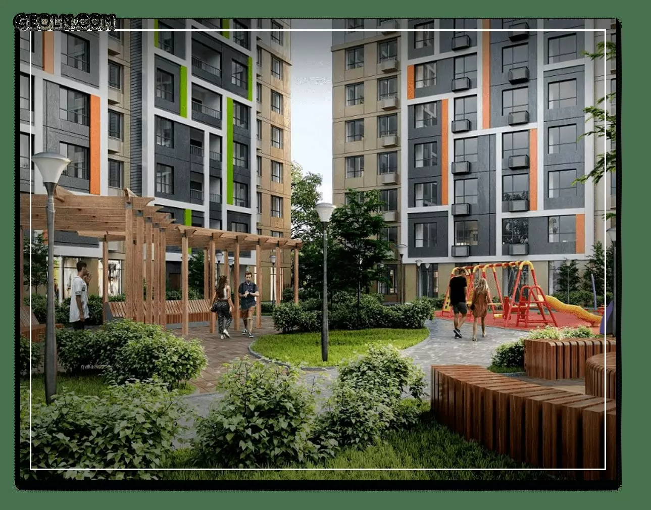 Поруч з новобудовою прокладаються проїзди і доріжки для пішоходів, покриті тротуарною плиткою. У дворі висаджуються декоративні рослини, облаштовується безпечна дитяча ігрова зона і затишні зони відпочинку для мешканців. Територія висвітлюється сучасними вуличними ліхтарями.