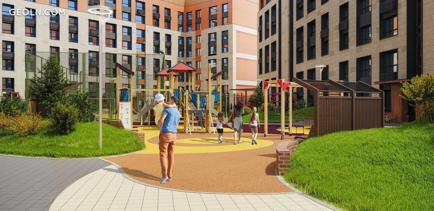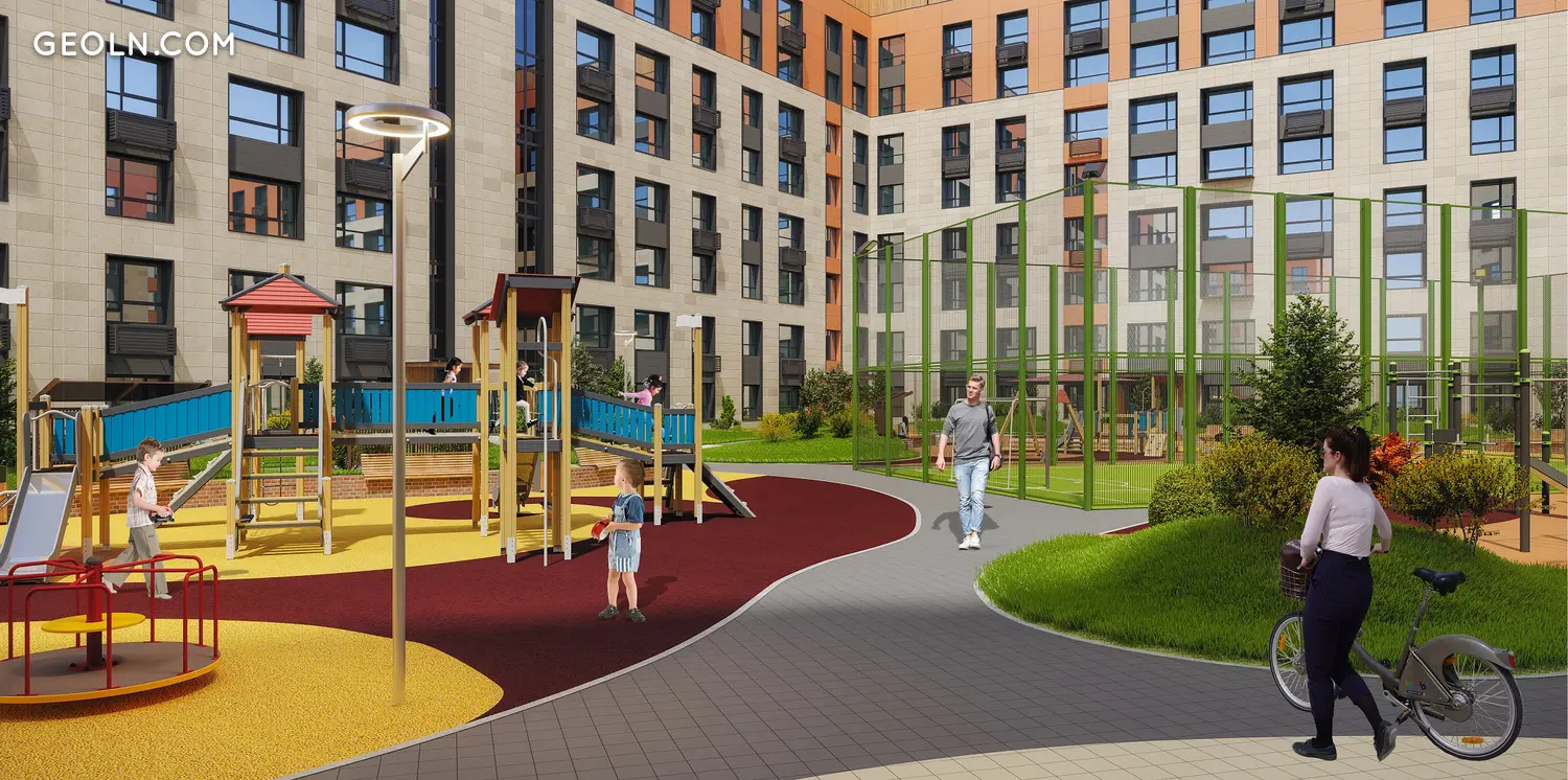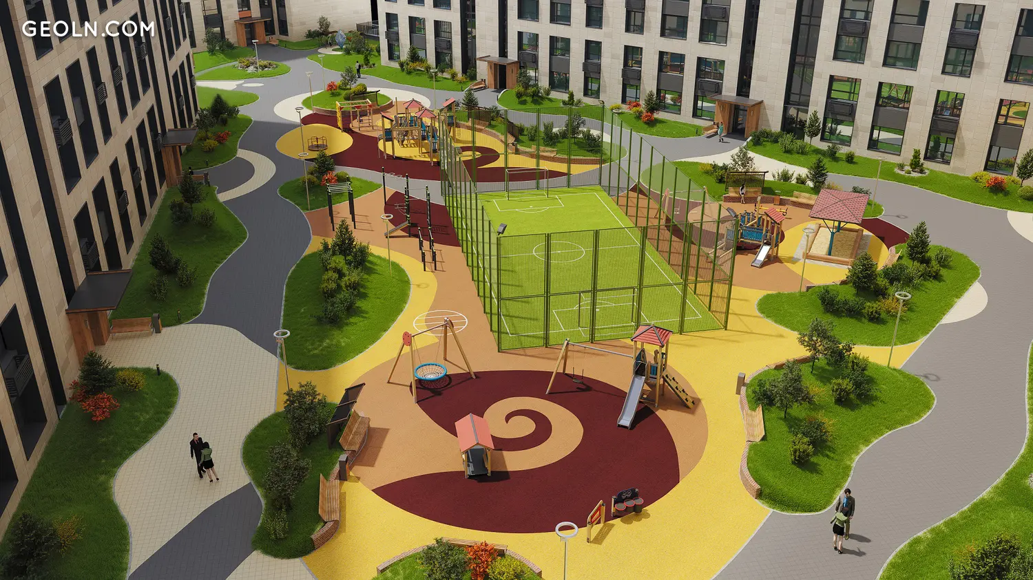 На подвір'ї розміщується велика дитяча ігрова зона з гойдалками та гірками, а також майданчик з вуличними тренажерами і зони відпочинку з альтанками. Споруджується обгороджене металевою сіткою футбольне поле, яке, як і дитячий майданчик, має безпечне покриття.