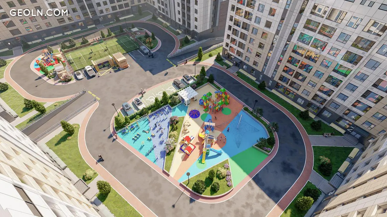 კომპლექსიდან 150 მეტრში არის დატვირთული საავტომობილო გზა, ძირითადად დაბალი კორპუსები და კოტეჯის ტიპის სახლები მდებარეობს.