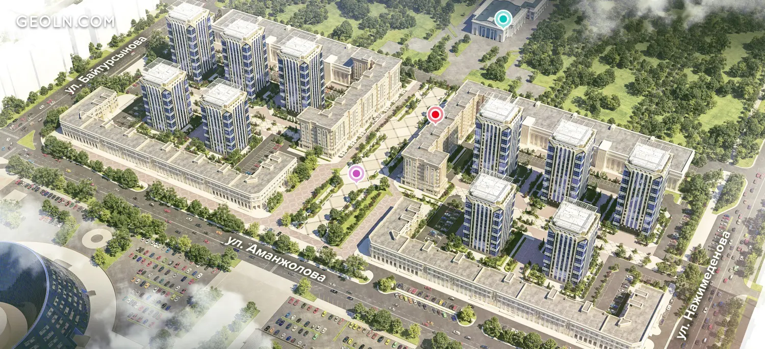 ЖК «Millennium Park» в Нур-Султана знаходиться біля Палацу Незалежності - з вікон новобудови відкривається мальовничий вид на головну площу країни. Комплекс розташований в районі з динамічно розвивається інфраструктурою - біля новобудови є всі об'єкти, необхідні для комфортного життя.