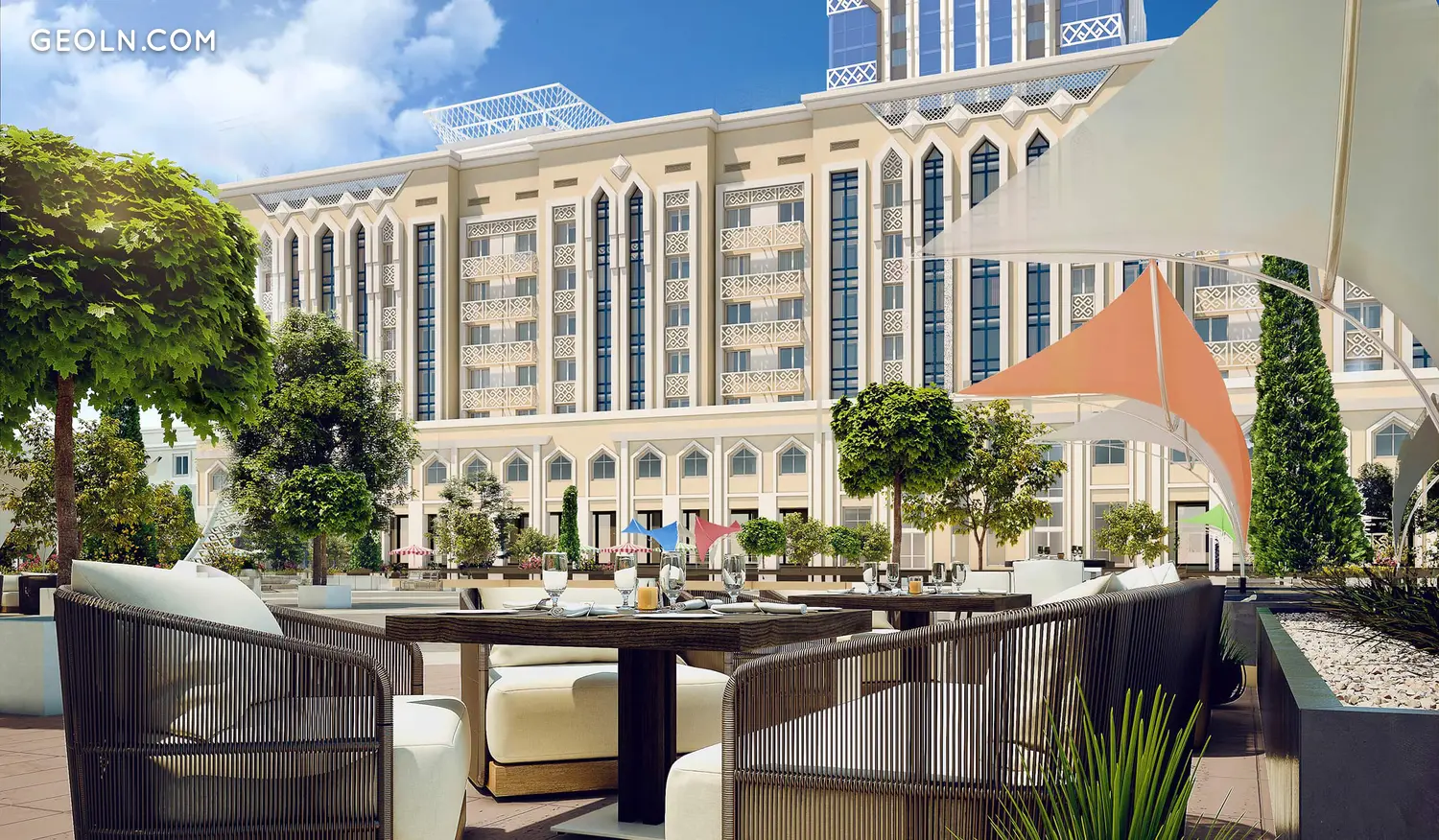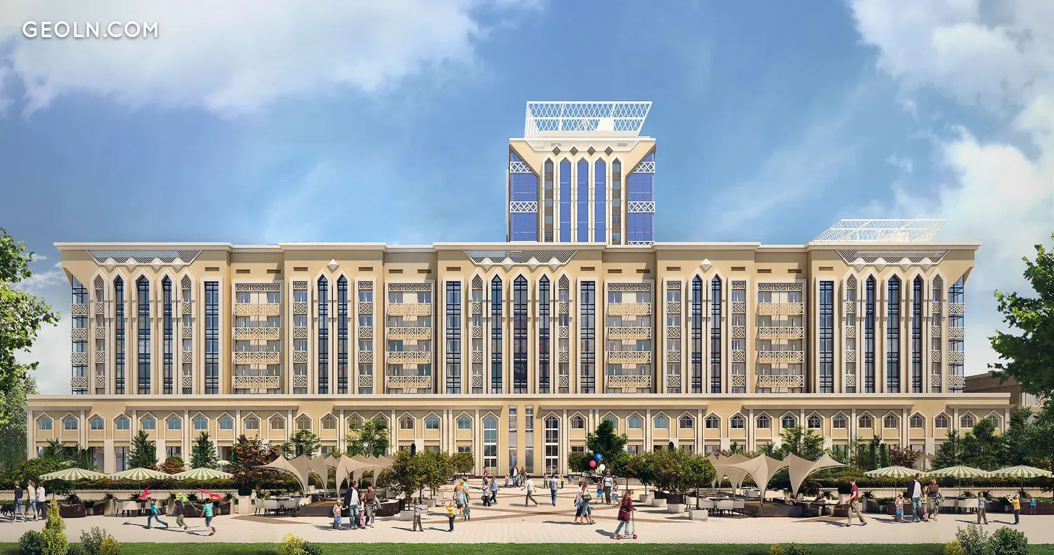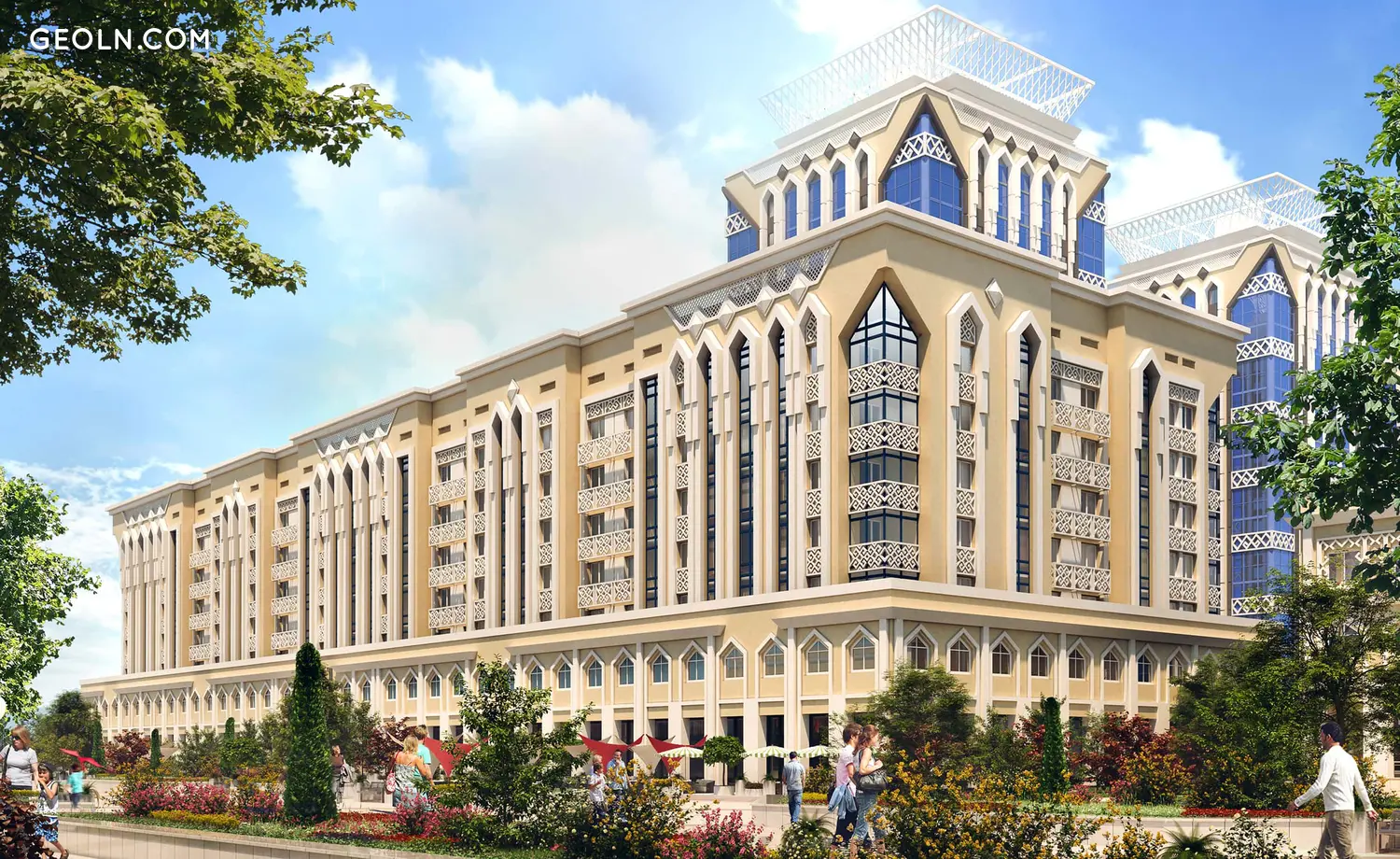 Основу конструкції кожного корпусу складає залізобетонний монолітний каркас, а зовнішні стіни, що не несуть серйозного навантаження, зводяться з газобетонних блоків. Фасади покриваються шаром нанести утеплювача, облицьовуються натуральним каменем і прикрашаються східним орнаментом.