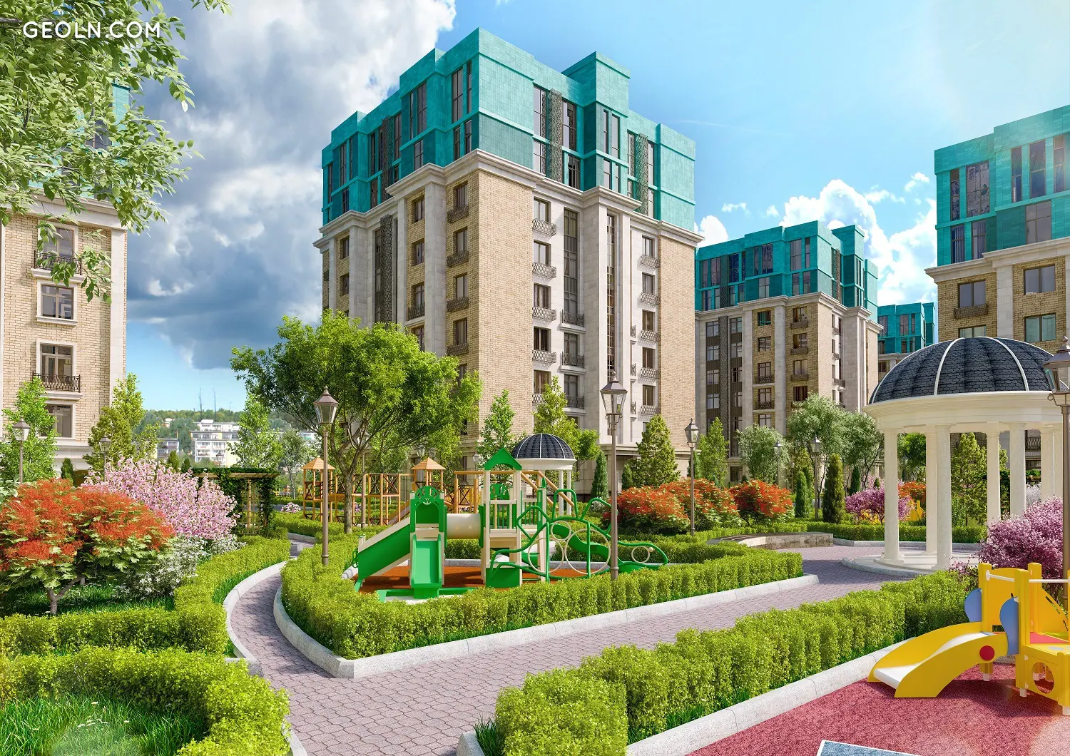 Територія AUSTRIA - справжній альпійський сад! Квіткові галявини, мальовничі стежки, альпійські трави, химерний малюнок ландшафту, розлогі дерева обіцяють незабутні, повні ро-мантіки прогулянки кожному, хто оселиться в цьому житловому комплексі.