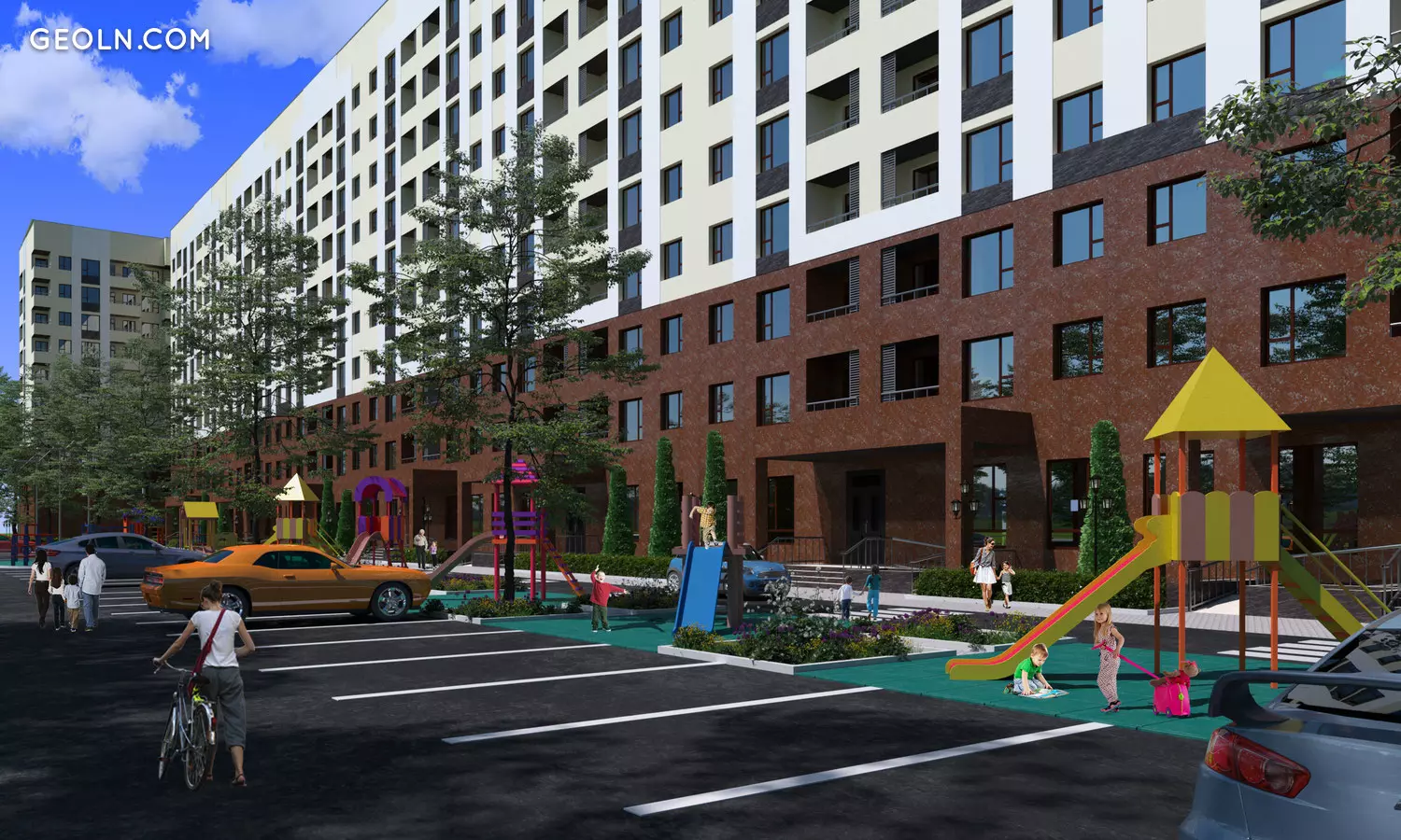 У дворі обладнана сучасний дитячий майданчик, на якій малюкам буде не тільки цікаво проводити час, а й безпечно. Також на території заплановано простір для паркування автомобілів, місця для прогулянок і відпочинку.