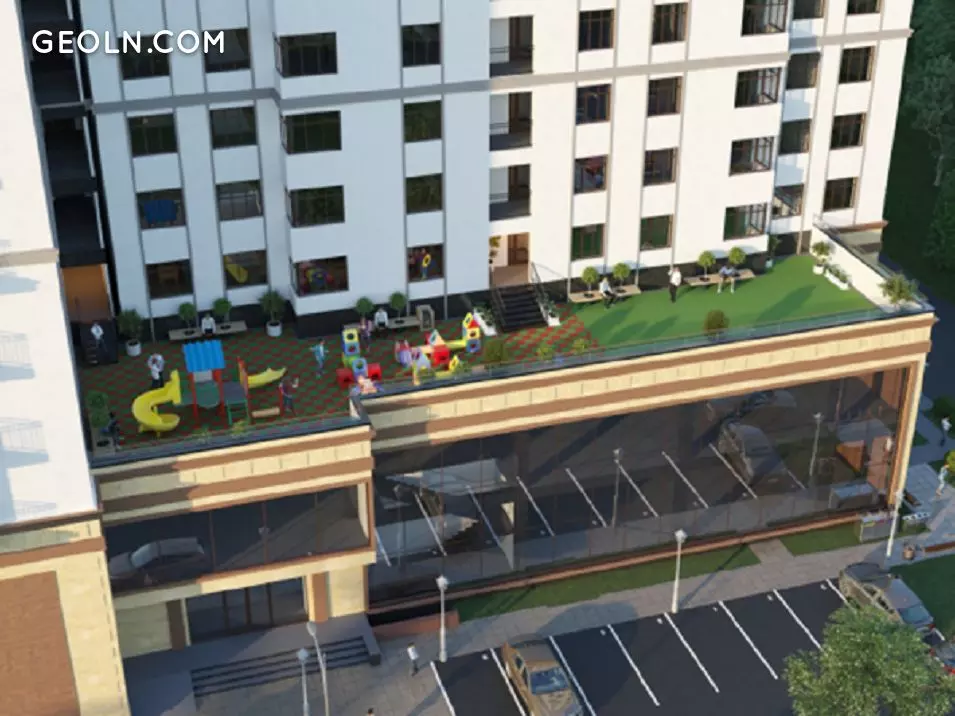 Одна з особливостей благоустрою території - розташування дитячого майданчика на терасі другого поверху. Це дозволило отримати затишну і безпечну зону для ігор з дітьми, де буде комфортно в будь-який сезон. Перший поверх відведений під розміщення комерційних об'єктів, на підземному рівні розміститься гараж для автомобілів.