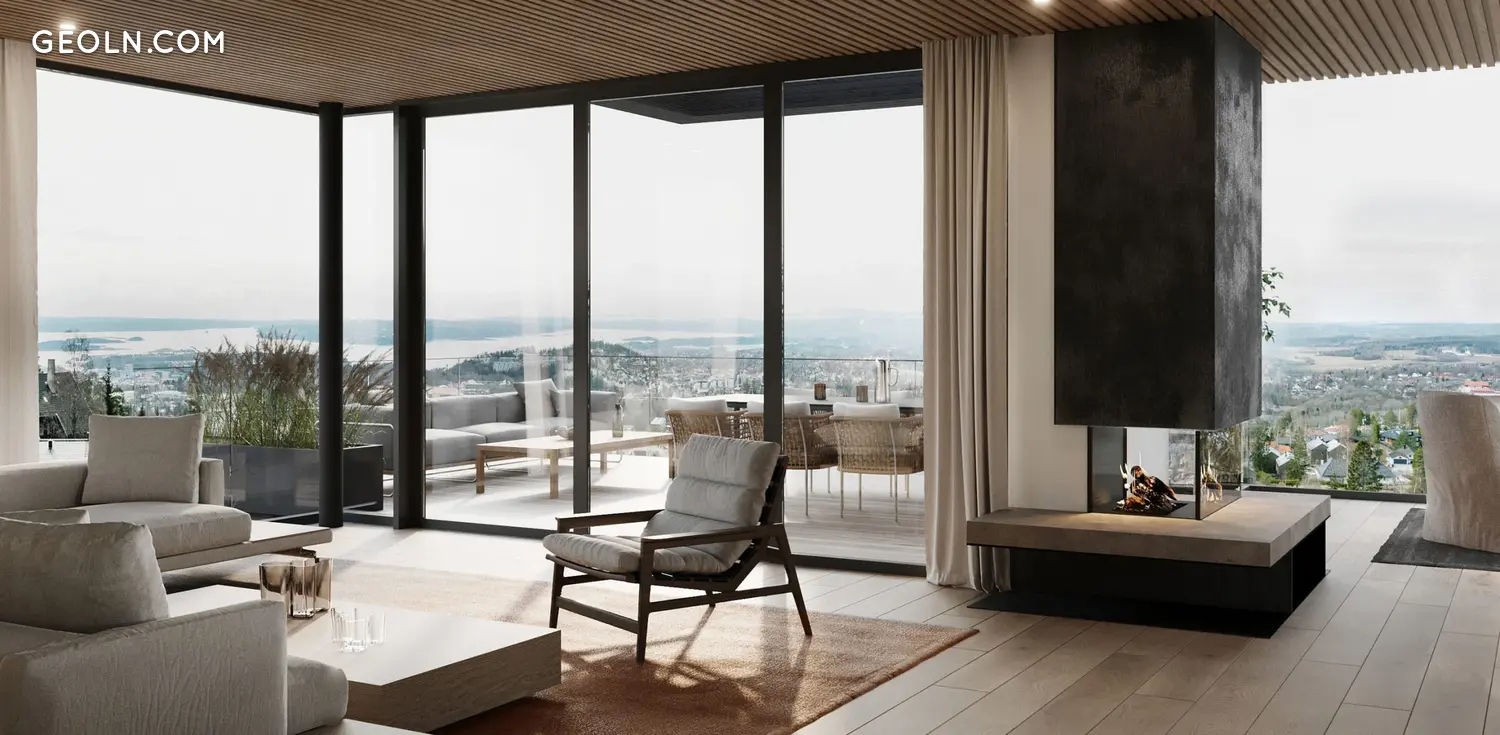 Усі квартири мають західні фасади з приголомшливим краєвидом, звідки відкривається вид від фіорду на півдні до Берумсмарки та Крокскогена на заході. У той же час, дуже особливе розташування та архітектура гарантують, що ви отримаєте казковий вид, але все ще захищене місце. І через вікна, і з власної великої тераси.