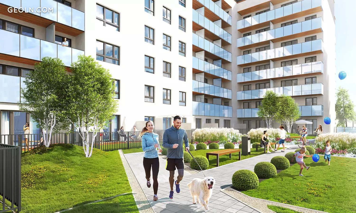 Площа інвестицій огороджена та контролюється. Навколо будівель є тротуари, доглянуті газони та рослинні композиції. Мешканці мають у своєму розпорядженні ігровий майданчик, сауну, ліфти, приміщення для велосипедів, станції зарядки для електричних та гібридних автомобілів. У підземному гаражі є паркувальні місця для паркування автомобілів. У загальній частині садиби є розроблений простір з лавками та кошиками для сміття. В межах садиби є комерційні приміщення. Інвестиція пристосована до потреб людей з обмеженими можливостями.