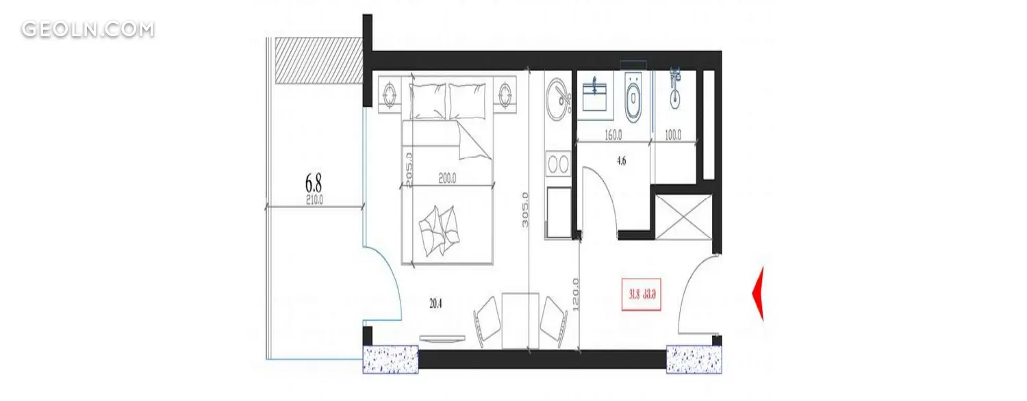 - Загальна площа: 38.6 м² (31.8 м² житлова + 6.8 м² балкон)