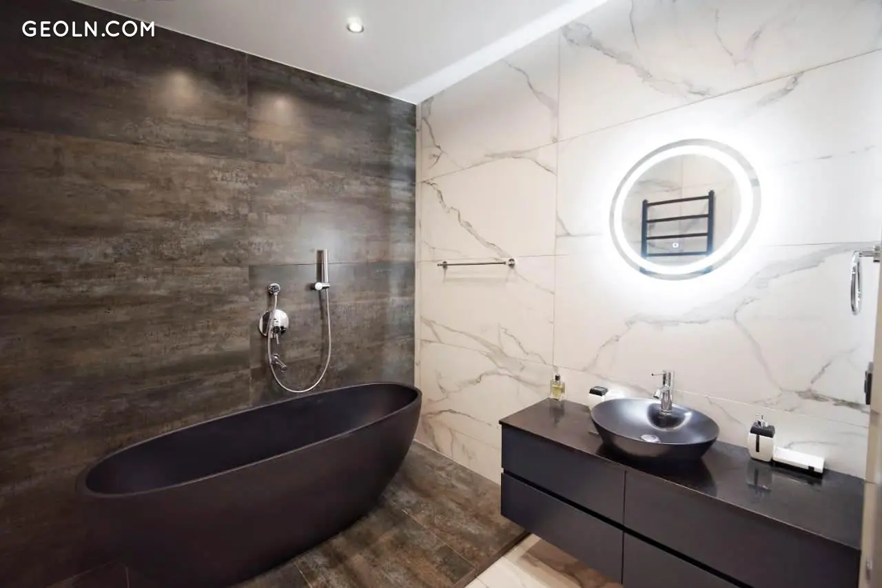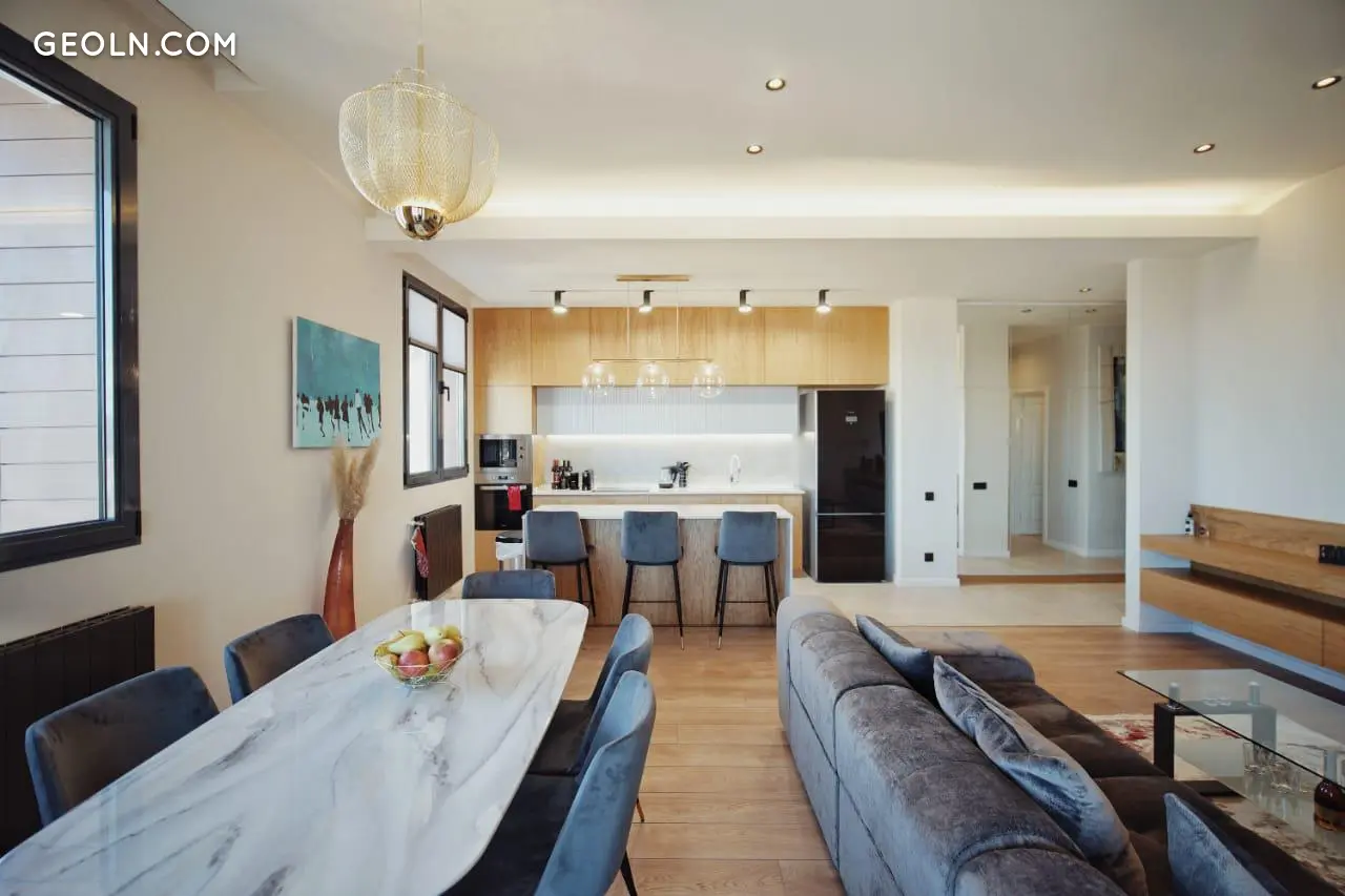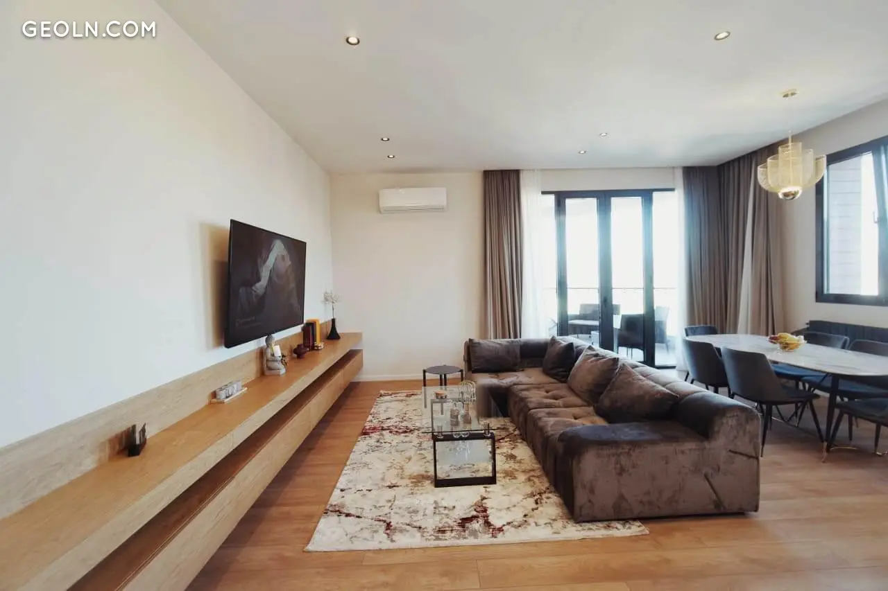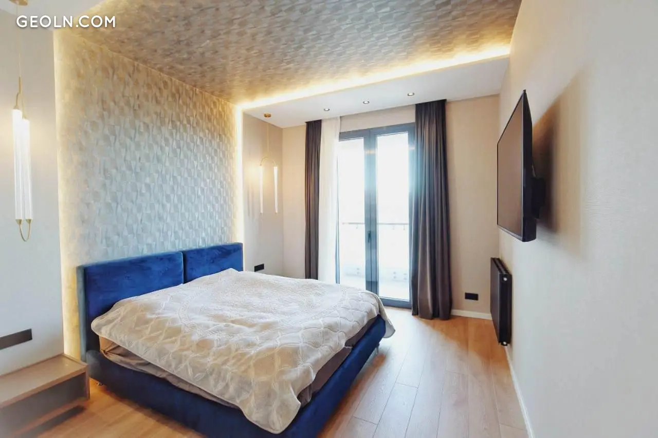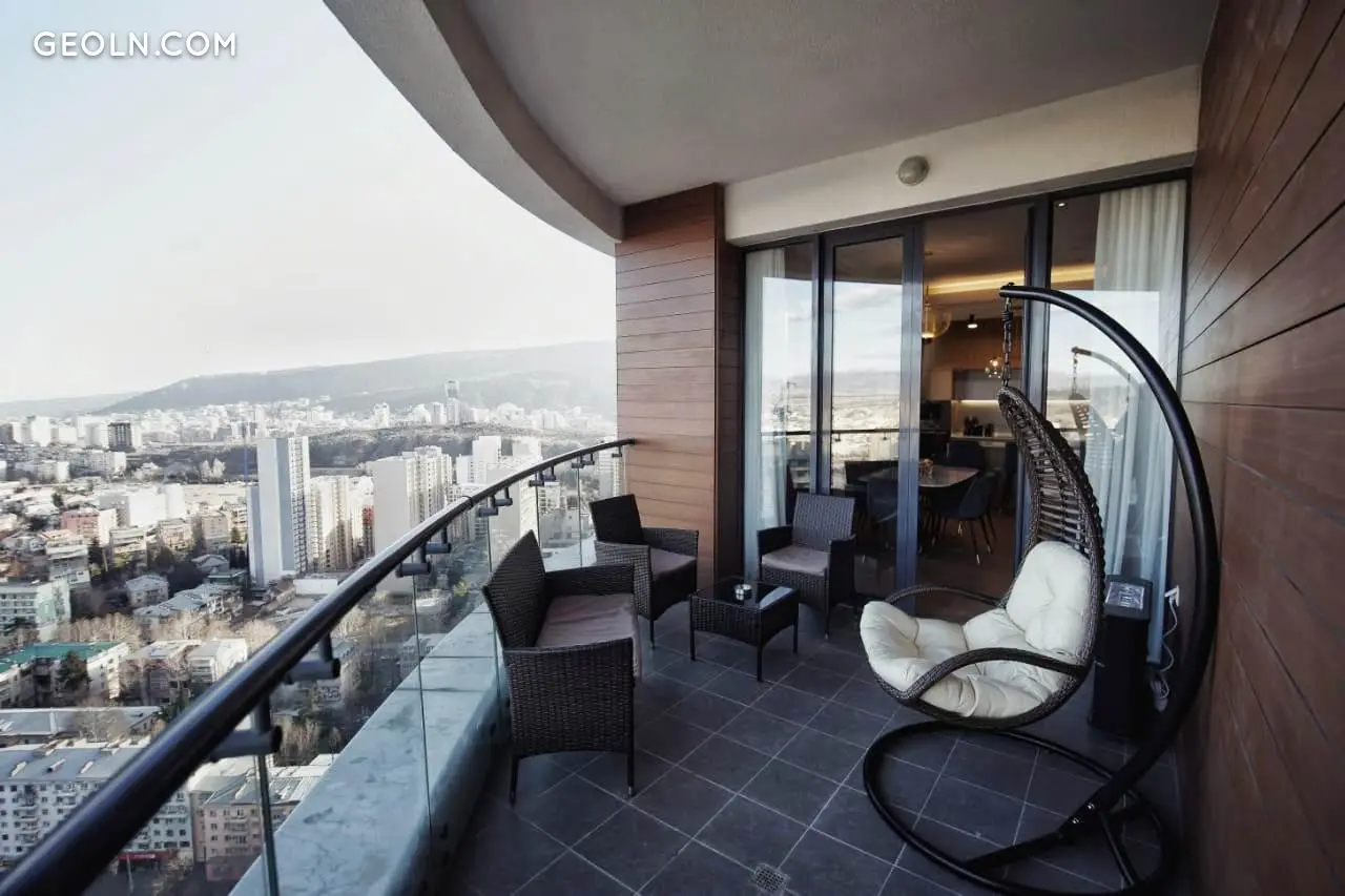 Оренда 3-кімнатної квартири в житловому комплексі «Тбілісі Гардens», на вулиці Асатиані, загальна площа квартири 127 кв. м, на 28(32) поверсі, з балконами, меблями та технікою, 1 спальнею та кабінетом, 3 санвузлами, охороною. Комплекс забезпечений басейном та тренажерним залом.