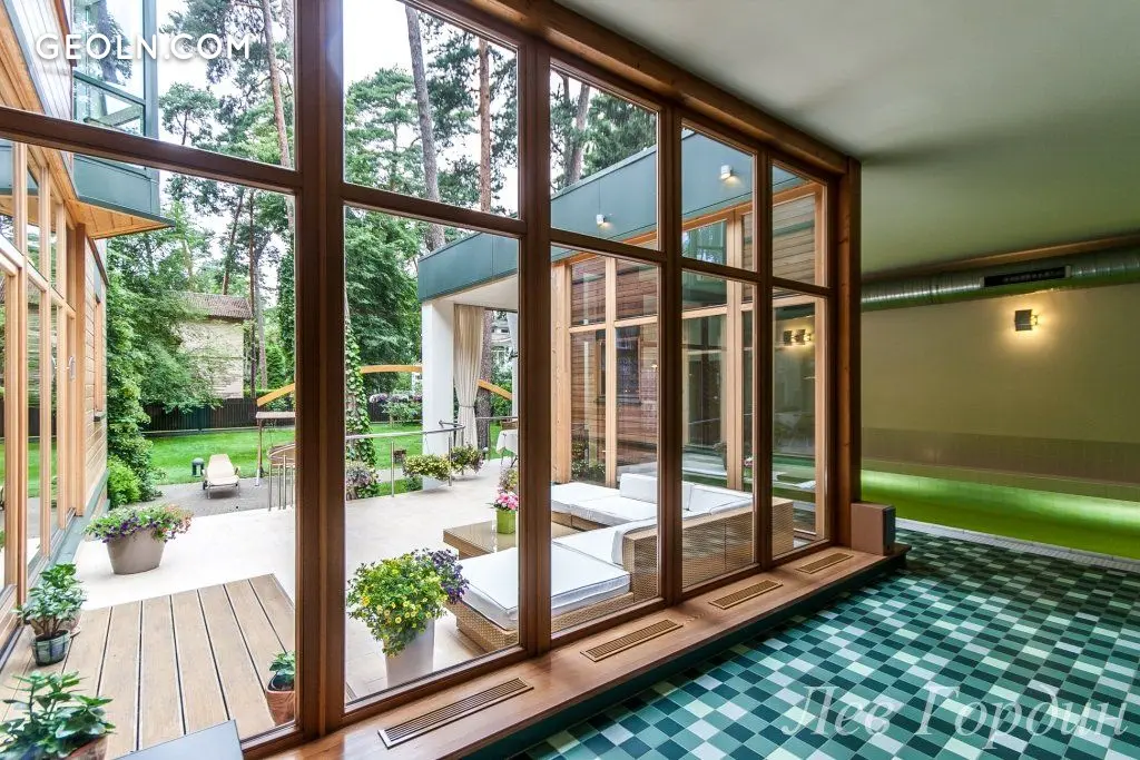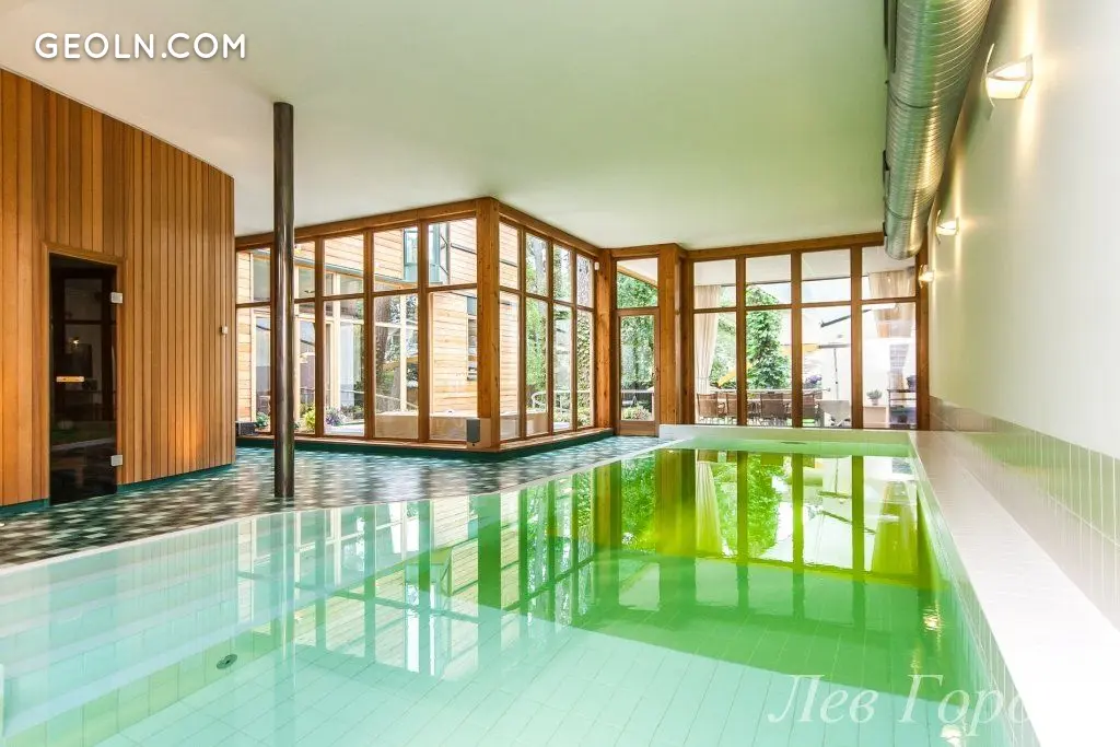 На першому поверсі: хол, вбиральня, простора вітальня з камінним залом, кухня, вихід на закриту терасу, басейн 11х4 м, лазня, душова, кілька санвузлів, підсобні приміщення.