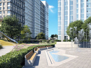 Прибудинкова територія упорядковується, виконуються роботи з озеленення. Обладнуються сучасні спортивні майданчики, дитяче містечко і гостьова автопарковка. Споруджується багаторівневий надземний паркінг, прокладаються згідно з планом забудови проїзди і бруковані тротуарною плиткою пішохідні доріжки.