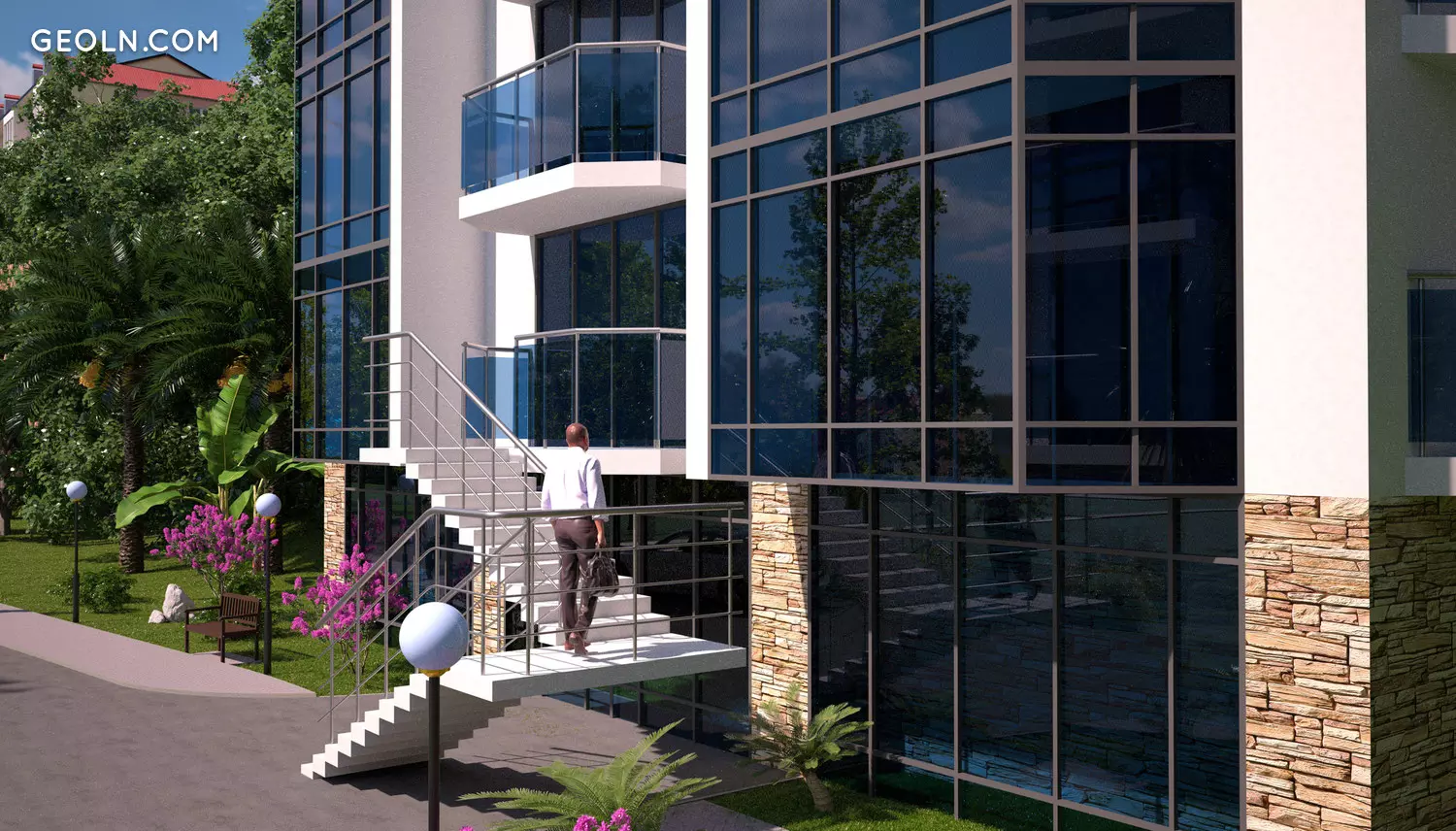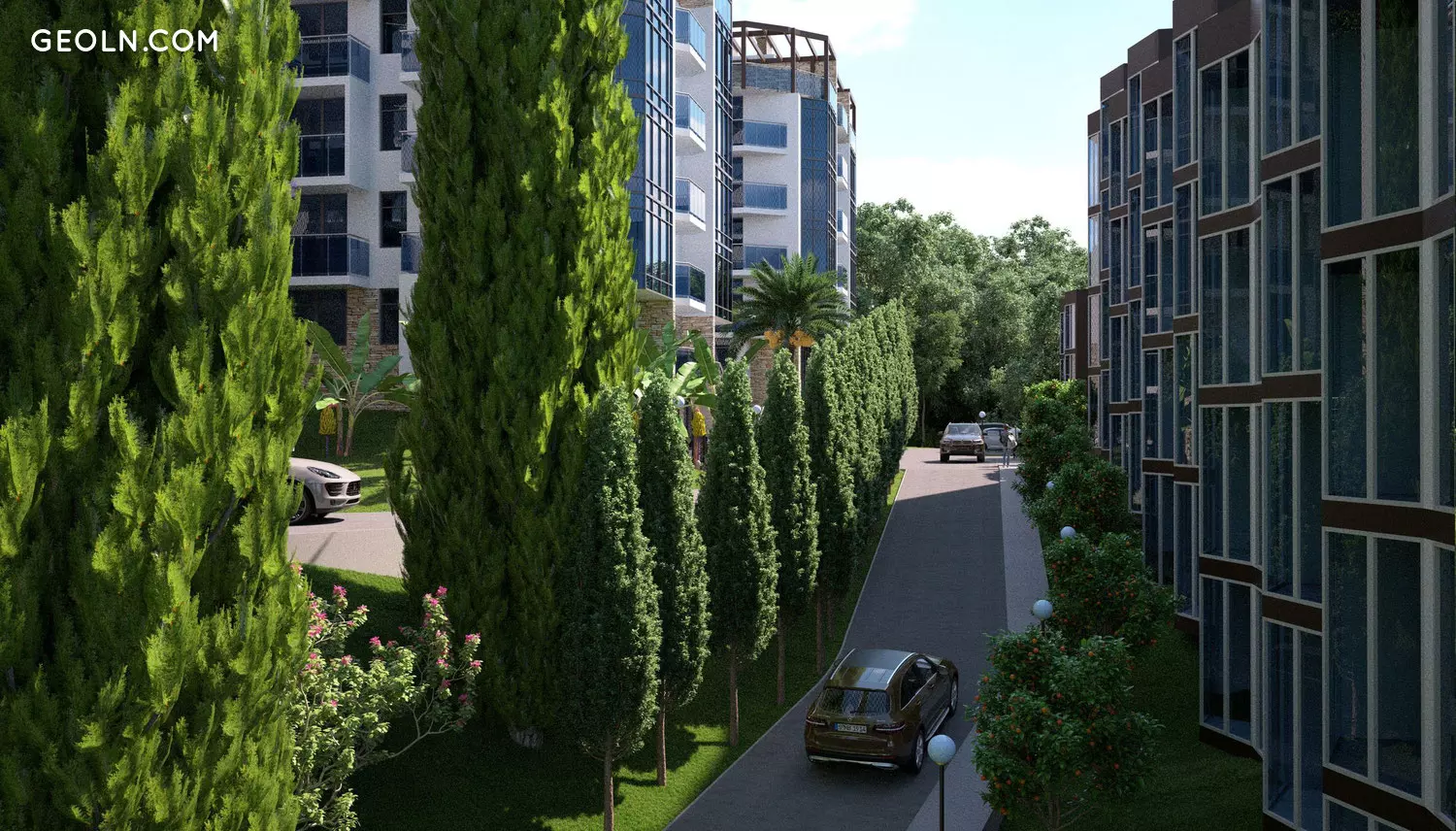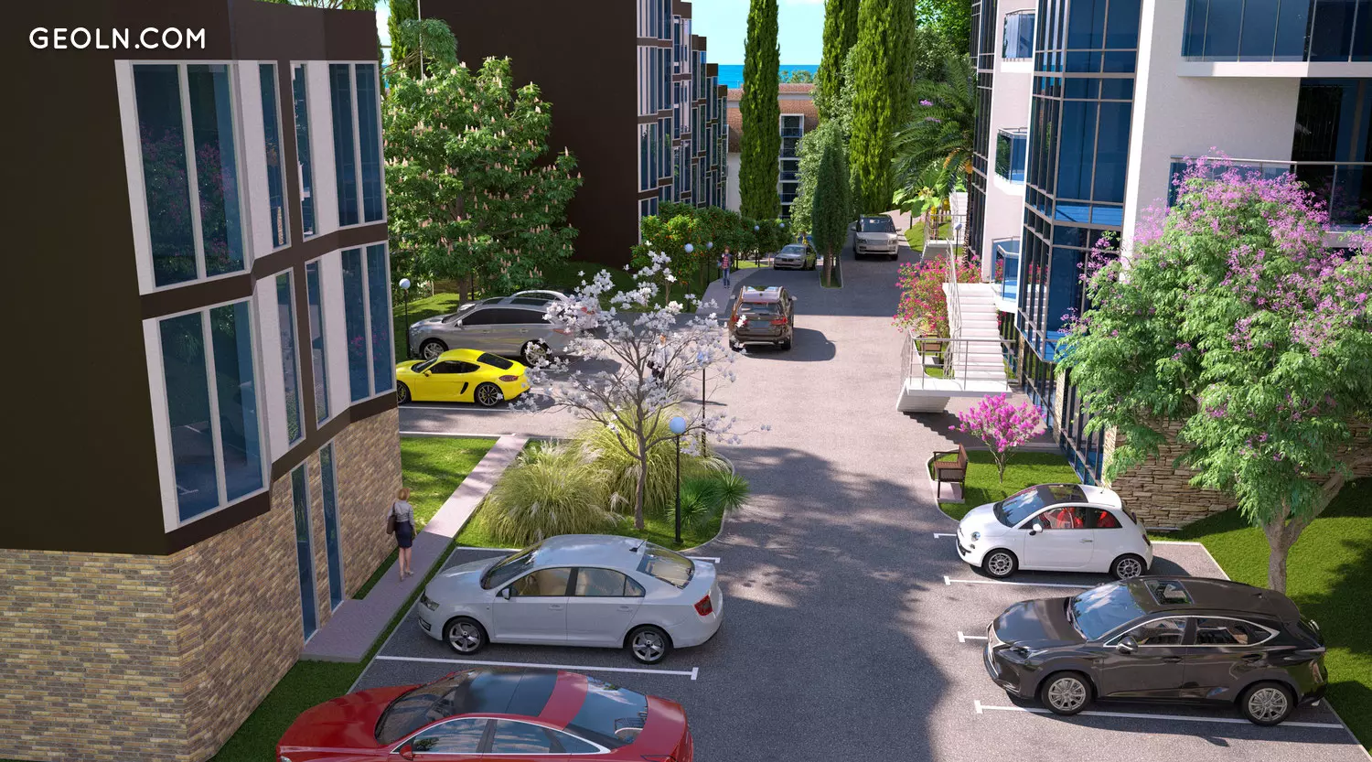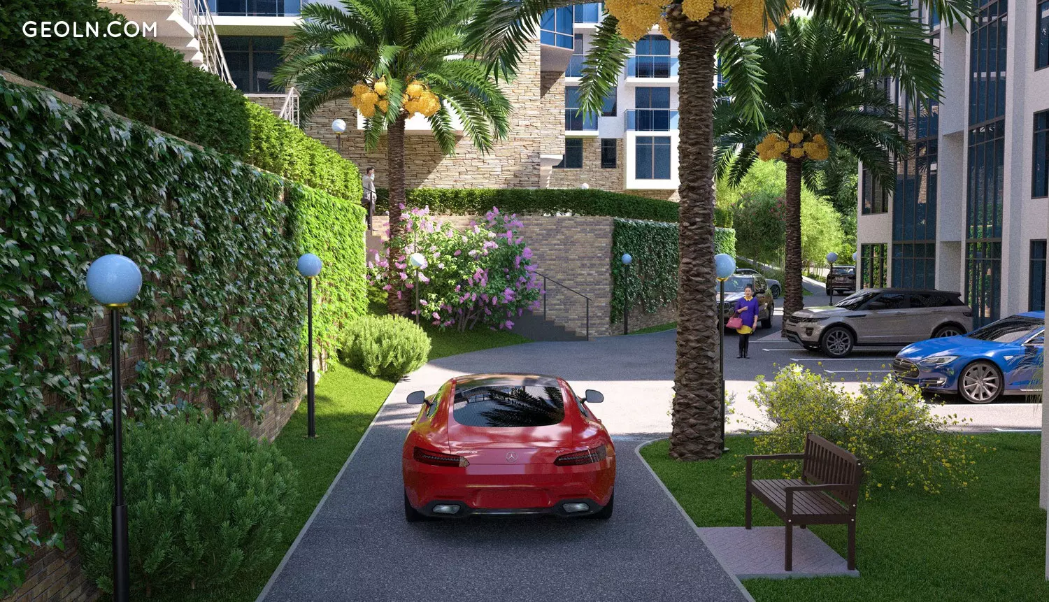 Планом забудови передбачено обладнання наземних автопарковок, прокладка проїздів та пішохідних доріжок з твердим покриттям. Виконується благоустрій та озеленення території, висаджуються дерева і чагарники. Встановлюються стовпи з освітлювальними приладами. Передбачено обладнання басейну, зони відпочинку і дитячих майданчиків. На перших поверхах розміщується СПА-салон, магазини, дитячий центр і кафе.