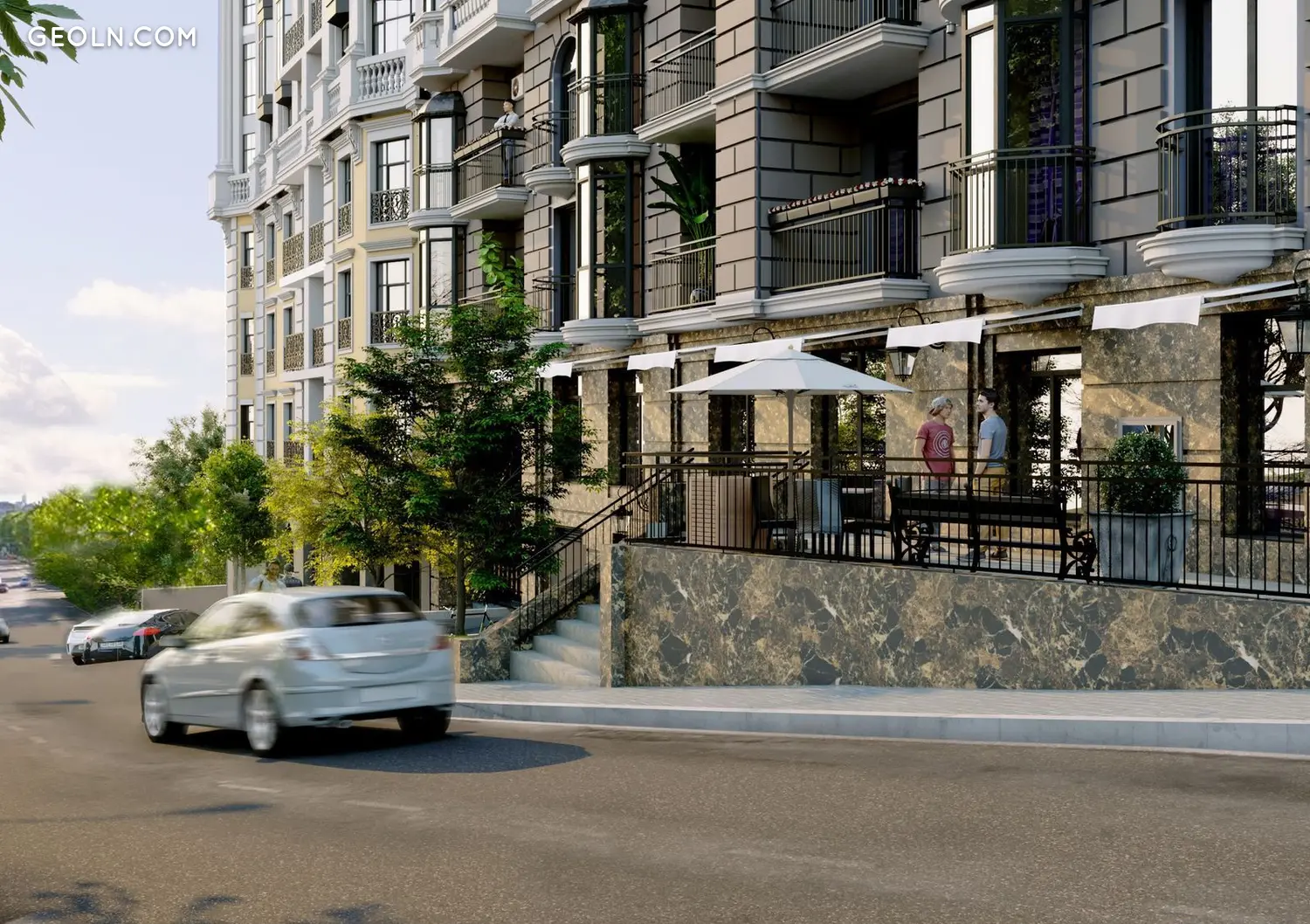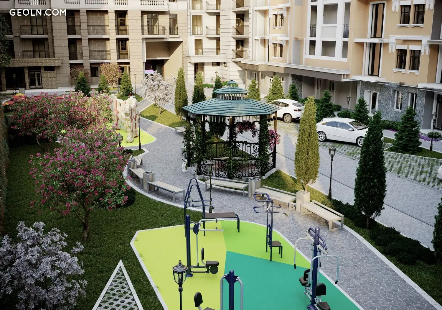 Територія новобудови закрита від автомобілів, виконуються роботи з благоустрою та озеленення. Влаштовуються проїзди і доріжки для пішоходів, обладнуються зони відпочинку і майданчики для ігор дітей, встановлюється сучасне вуличне освітлення. Також споруджується просторий підземний паркінг.