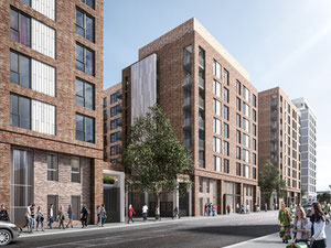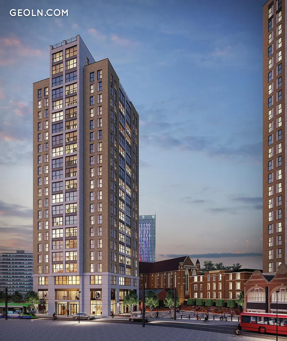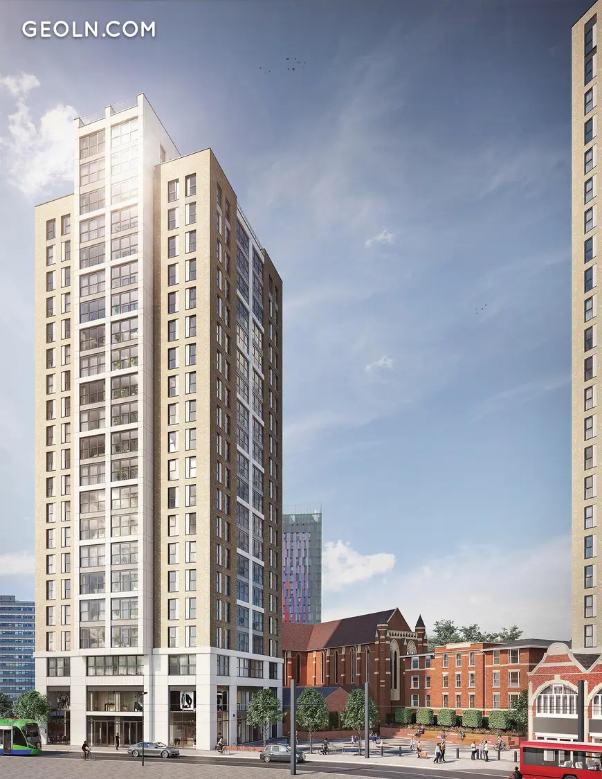 Лондонська площа Кройдон-це сучасний 20-поверховий житловий комплекс, який своїм екстер’єром виділяється з горизонту міста. Висока будівля оброблена золотою цеглою, яка вдень відбиває сонячне світло. Середні частини будівлі виконані в білому кольорі і виступають із загального фасаду. Численні вікна від підлоги до стелі в темних рамах симетрично розташовані по всій будівлі.